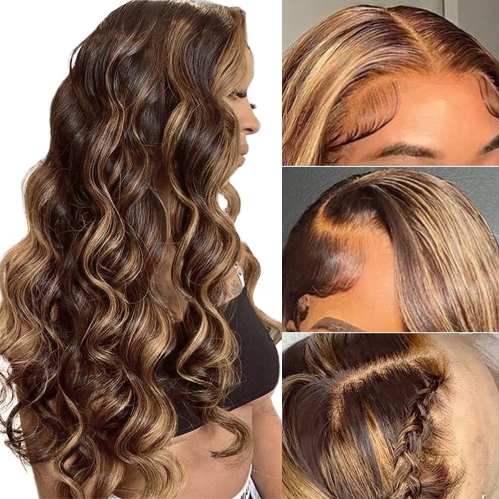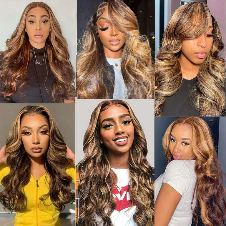 "Wigs Type:4×4Highlight P4/27Body wave lace wig made of 100% human hair for black women, no shedding, no tangle, shiny and silky.