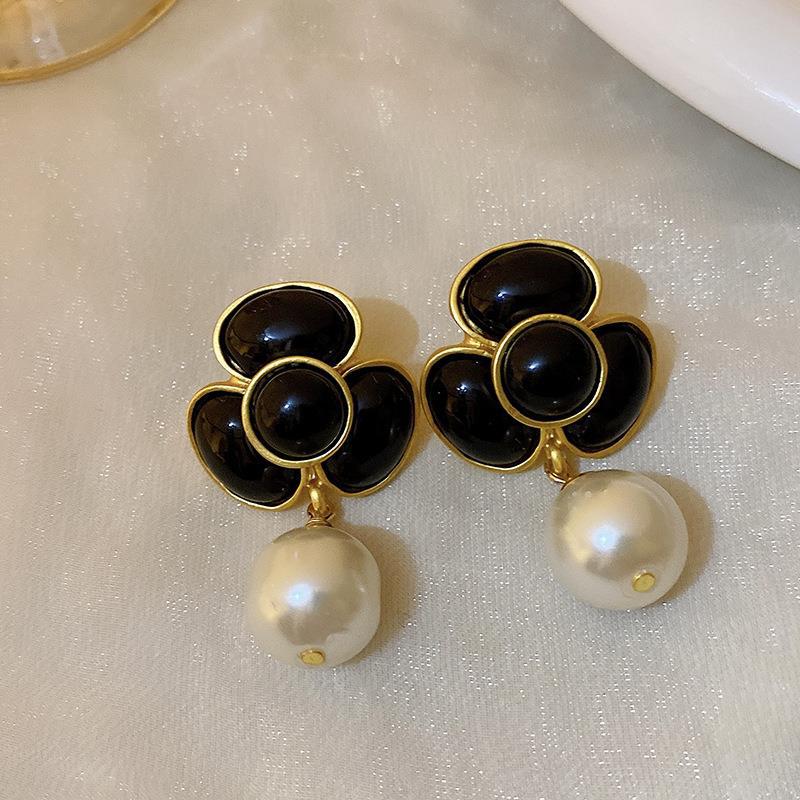 silver needle oil-spot glaze flowers pearl oval earrings