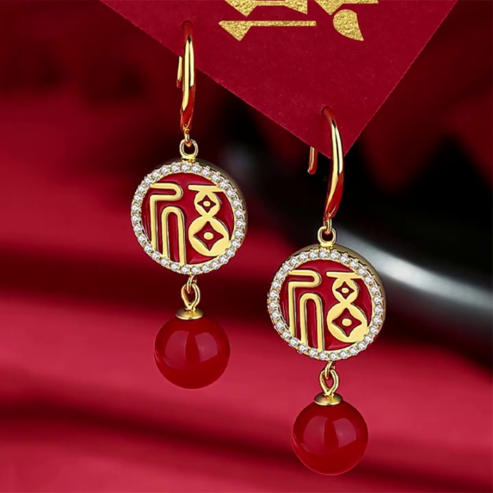silver needle: red dripping oil + white diamond fu character ear studs