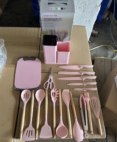 storage barrel wooden handle kitchenware 19-piece set (light pink)