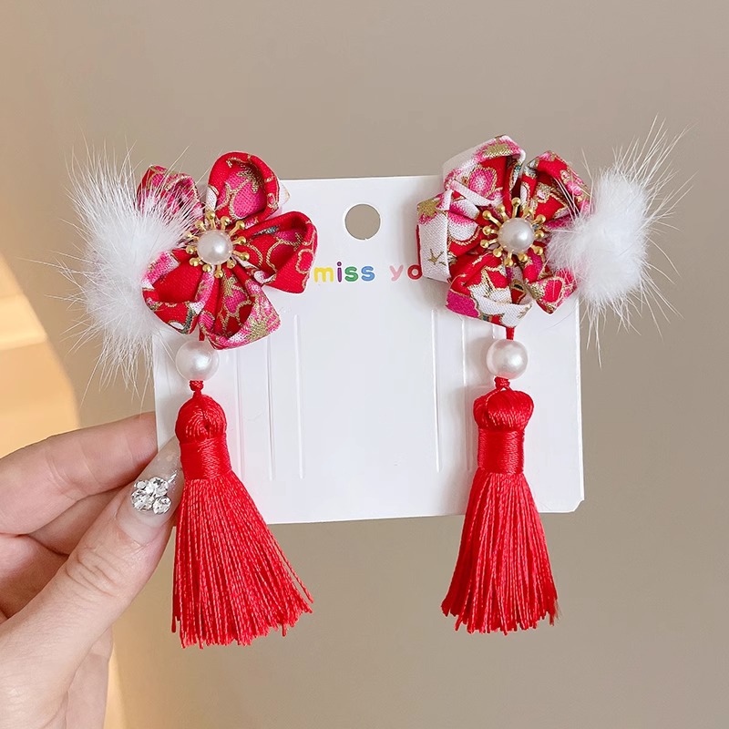 21# red pom-poms flower cluster bow tie pearl tassel a pair of hairclips