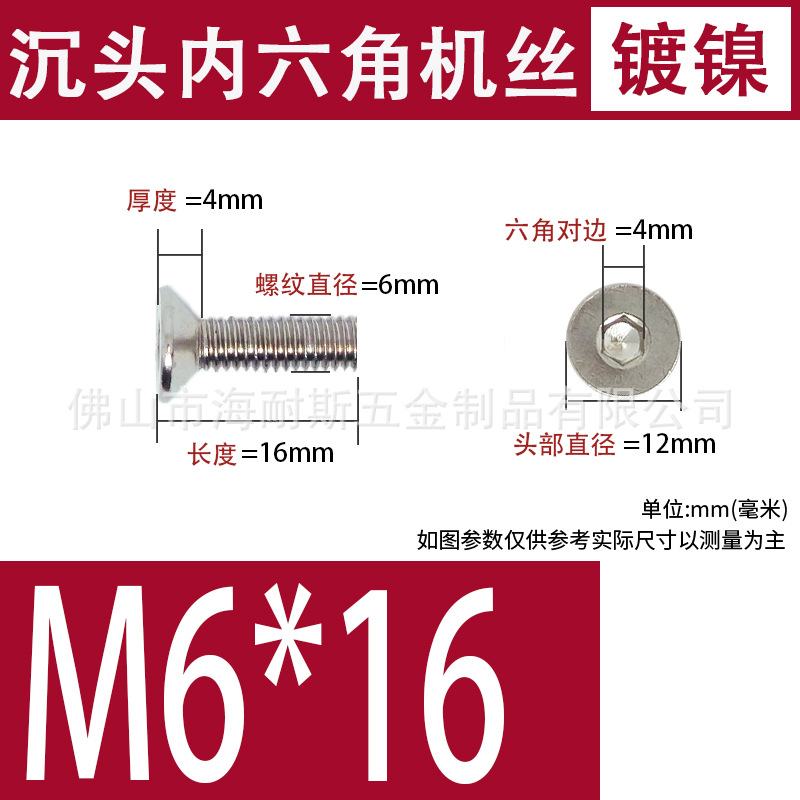countersunk head hexagon m6 * 16 nickel plated