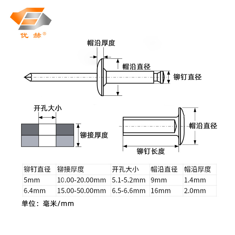 5mm diameter (riveting 15mm-20mm thickness) 50 sets