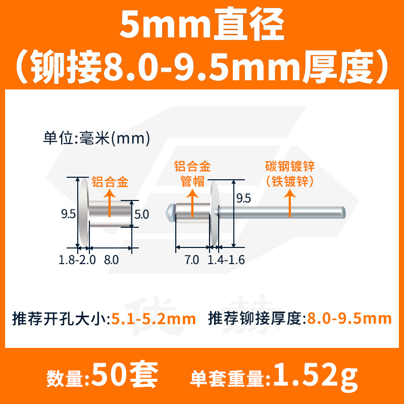 5mm diameter (riveting 8mm-9.5mm thickness) 50 sets