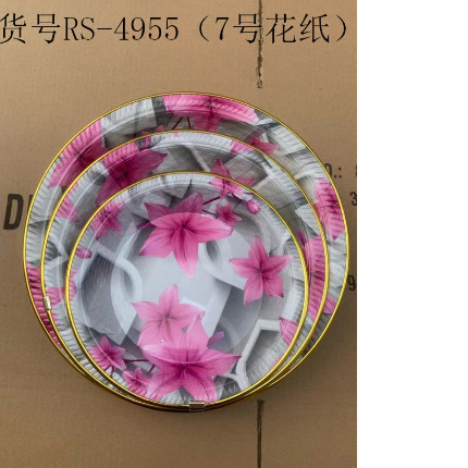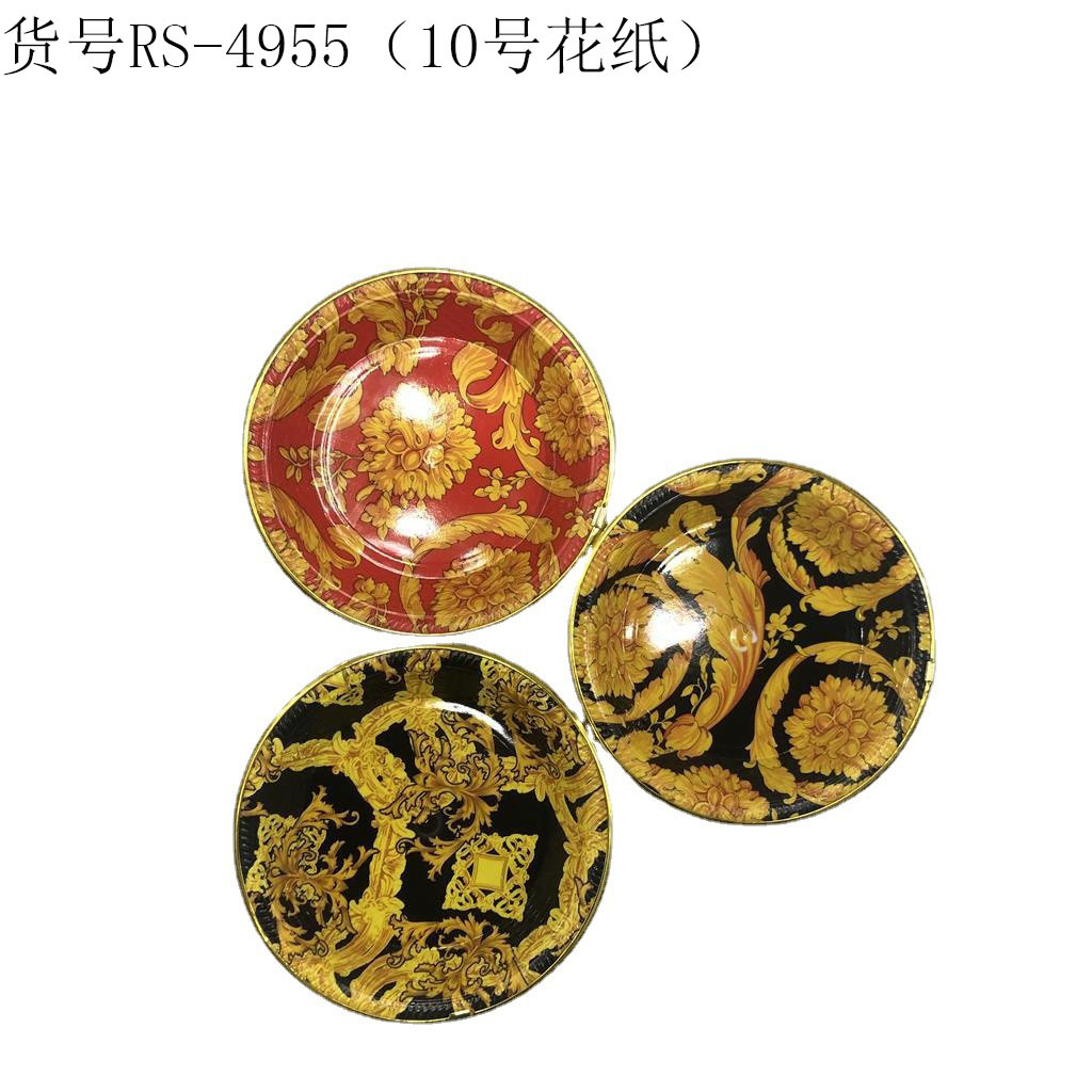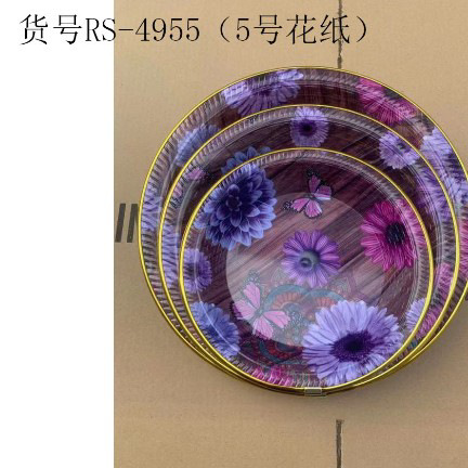 ITEM NO.【Product Model Number】: RS-4955 (Small Size) NAME【Product Name】: Gold-edge Round Flower Paper Plate QTY【Quantity】: 300 pieces "CBM【纸箱体积】:0.07 Material【Product Material】:PP Color【Product Color】:mixed loading Weight: 84 grams Packaging【包装方式】:Bulk "W.G【Gross Weight of a Full Container】:26kilogram N.G【Gross Weight of the Full Container】: 25 KG"斤"在中文中通常指的是重量单位,1斤等于500克。如果您需要翻译其他与"斤"相关的文本,请提供具体内容。 SIZE【Product Size】: Maximum Diameter 21.7*高3centimeter