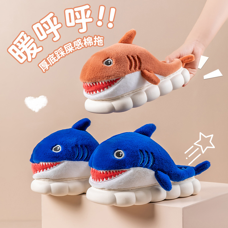 women's cotton slippers autumn and winter 2024 new indoor shark home non-slip thick bottom and warm keeping velvet cotton slippers