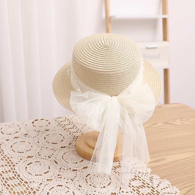 Korean Style Pearl Mesh Parent-Child Straw Hat Japanese Style Fresh Bow Bandage Straw Hat Girls Spring and Summer All-Matching