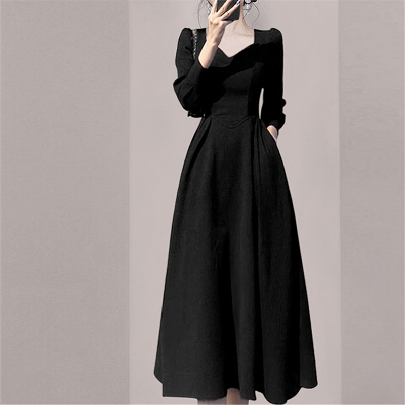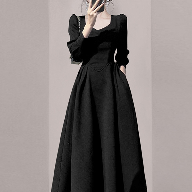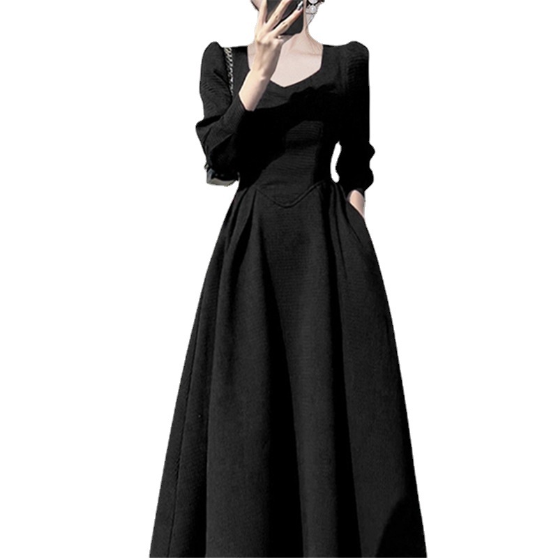 Hepburn Style Retro High-Grade Black Waist Dress 2024 Early Spring New Women's French Temperament Square Collar Dress