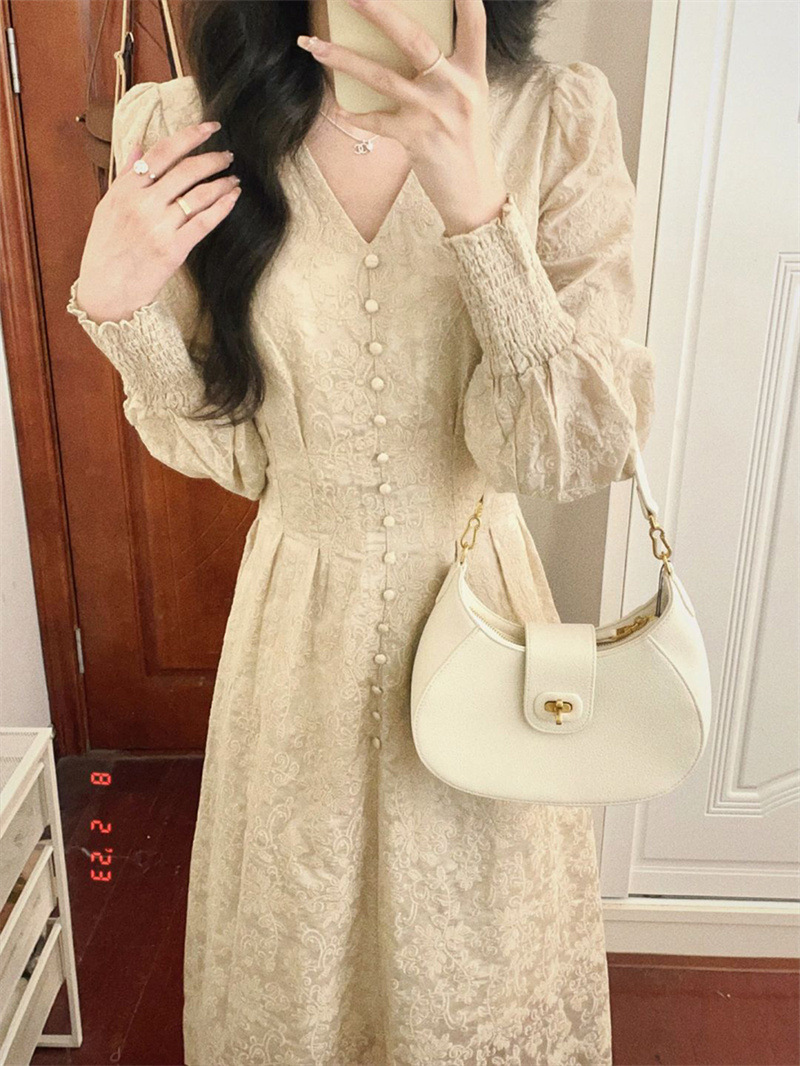 French Style Retro V-neck Heavy-Duty Long-Sleeved Dress for Women Spring/Autumn Court Style High-Grade Temperament A- line Long Dress
