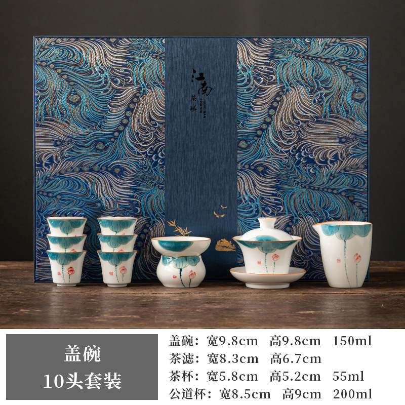 Hand Painted Sheep Fat Jade Tea Set Chinese Lotus Pattern with Gift Box Kung Fu Teapot Cover Bowl Tea Cup Tea Set Wholesale
