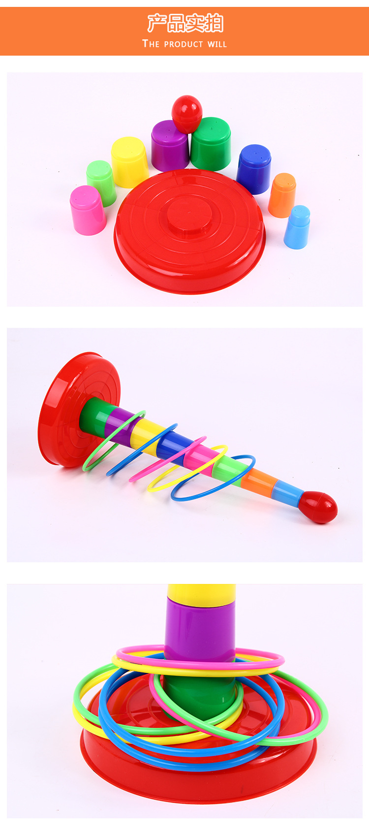 It is also a tool for collective activities and fun competitions during holidays! After opening the packaging, teach your baby to identify the colors of the Rainbow Stacking Tower and the rings, then stack the columns in the correct order from large to small, and then you can play the ring toss game.