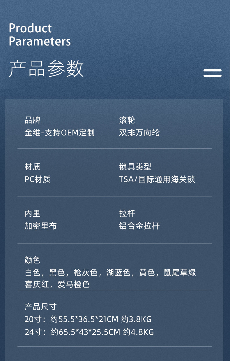 | 20-inch 55.5*36.5 * 21cm | CN¥ 412.5 | 999808 piece available |
