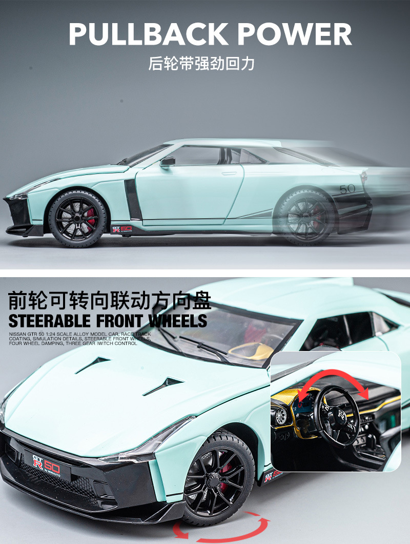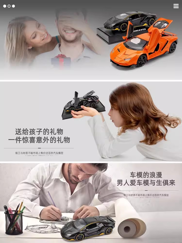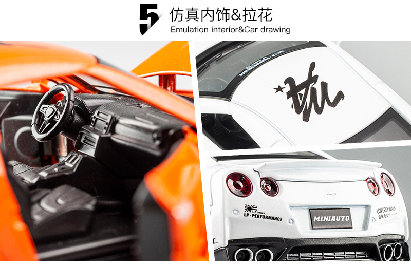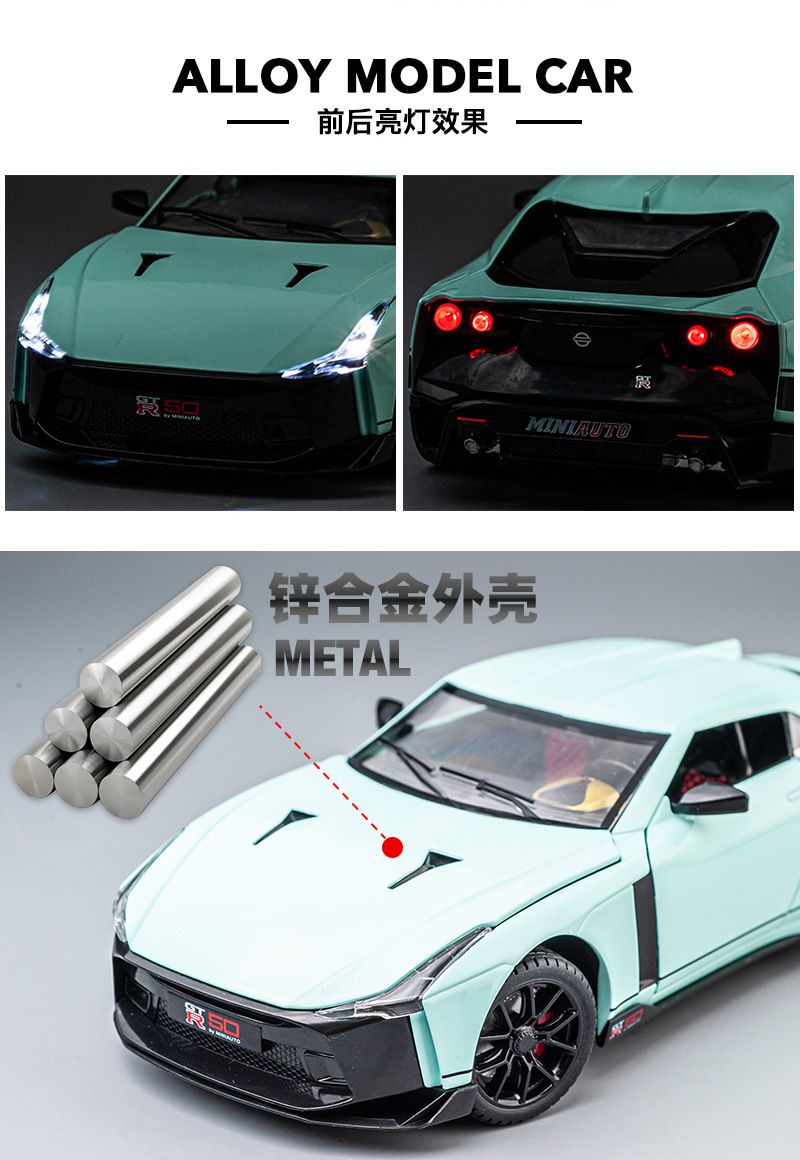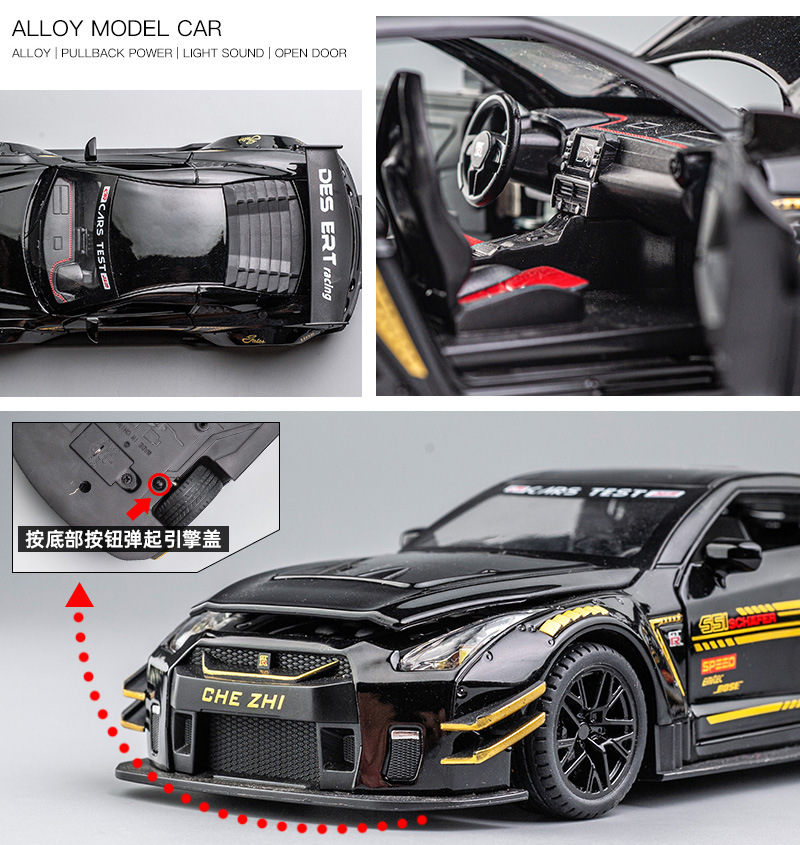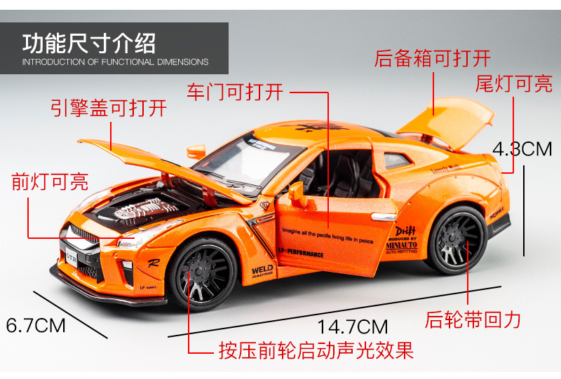 【Product Features】The body is made of zinc alloy, the base is made of plastic, and the tires are made of rubber; both doors can be opened, and the front hood and trunk can be opened; pressing the front wheel/opening the door can activate sound and light effects, and the rear wheel has a return force function.
