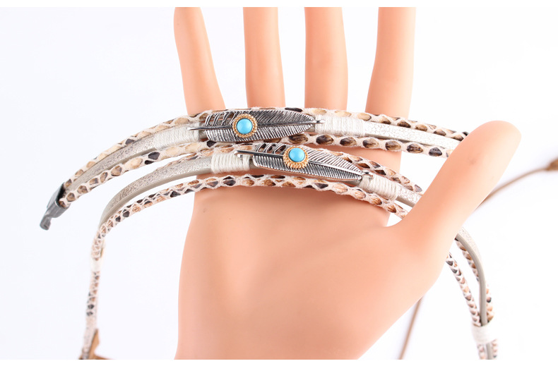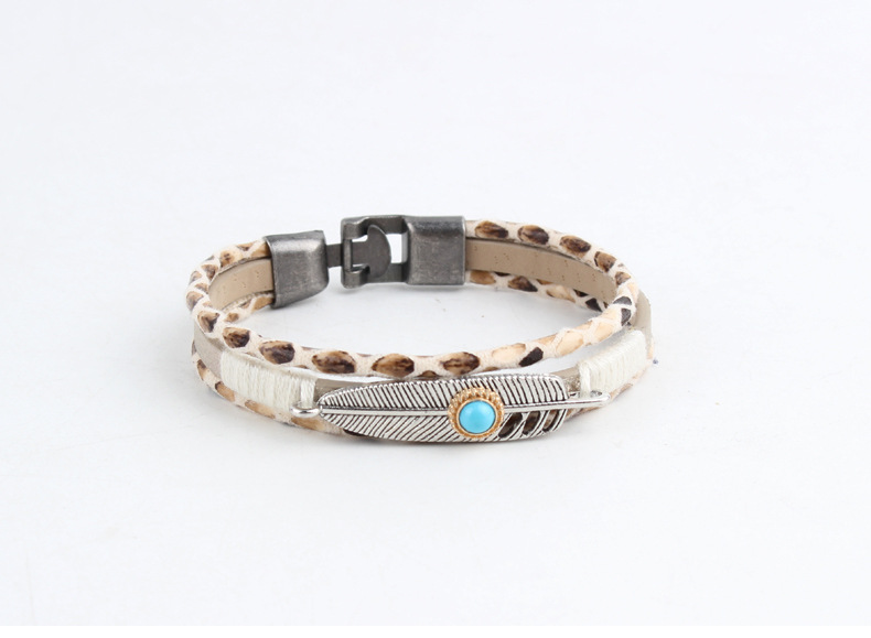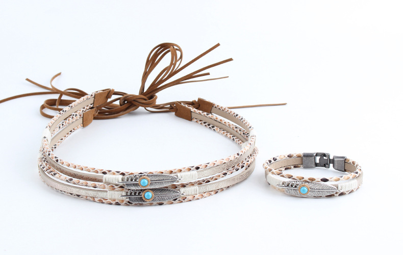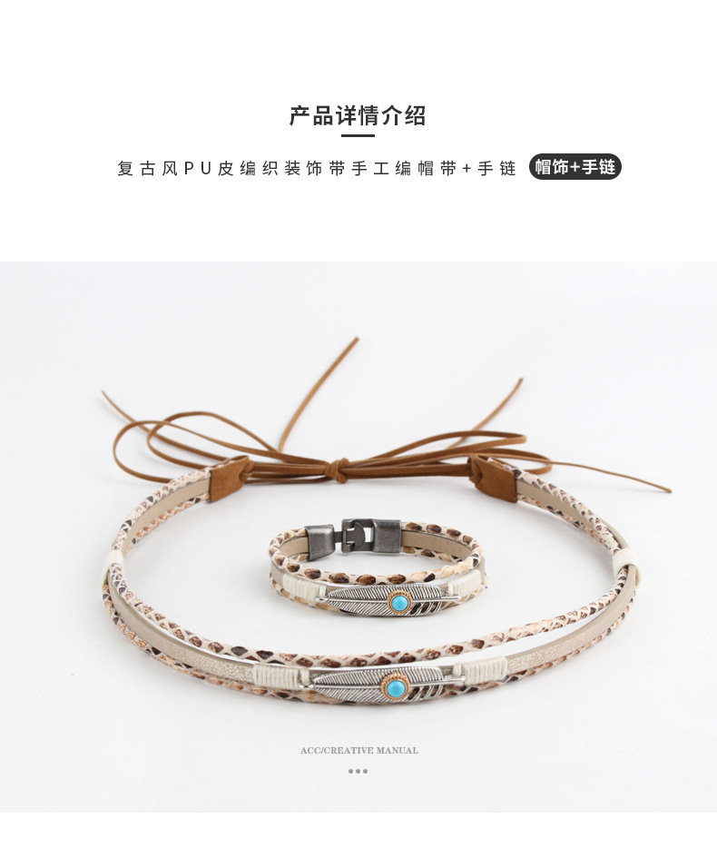 original fashion simple pu leather matching alloy feather decoration hat accessory + bracelet set wholesale diy straw hat bib