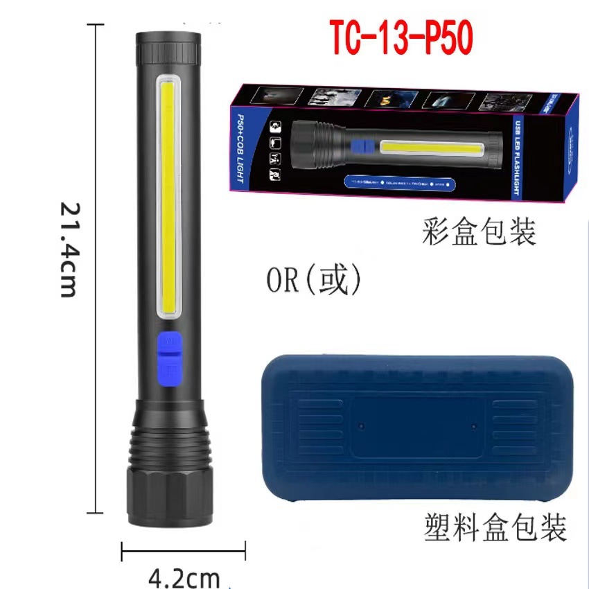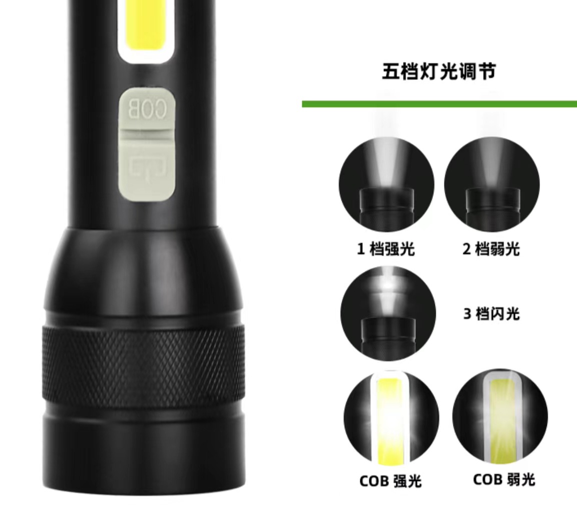 Cross-Border New Arrival Cob Sidelight Aluminum Alloy Telescopic Zoom Strong Light Charging Waterproof Flashlight Outdoor Long-Range White Laser