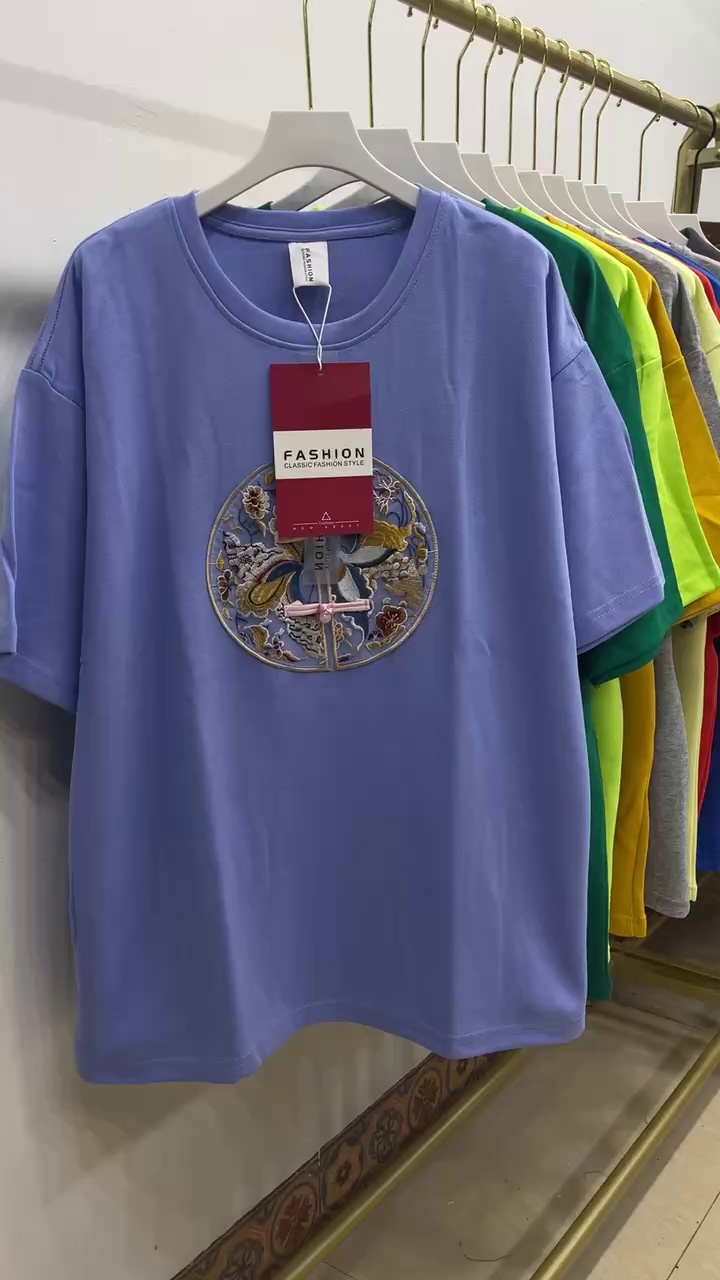 New Style Cotton Short Sleeve Women's Embroidery Buckle Oversized T-shirt Bag Collar Raglan Sleeve Loose Cotton T