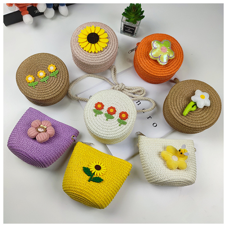 2024 new mini straw bag flower woven small bag children's crossbody coin purse little girl seaside straw bag