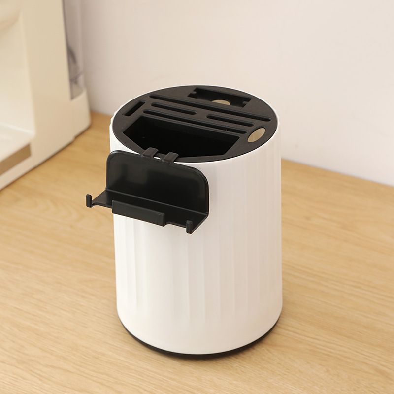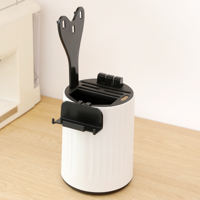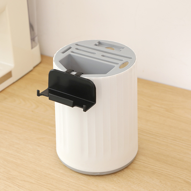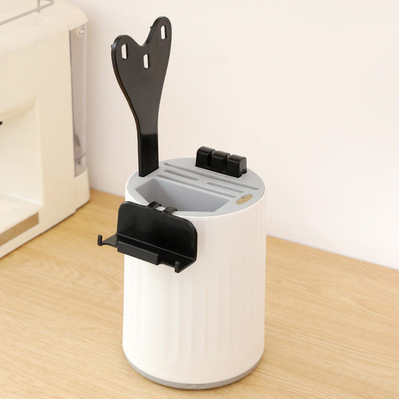 white and gray knife sharpener with mobile phone holder