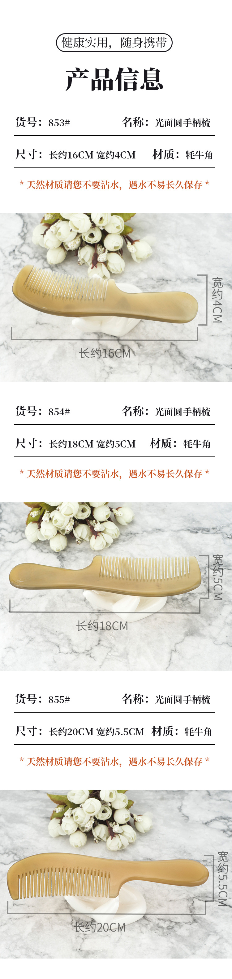 854# glossy round handle comb length about 18cm width about 5cm