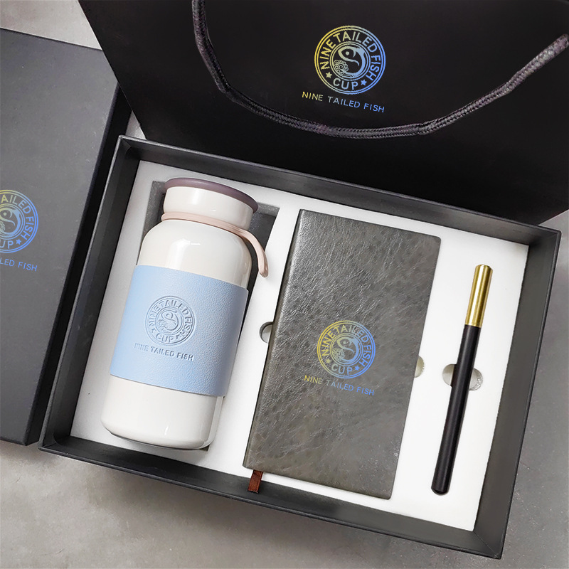 white thermos cup + gray book + pen