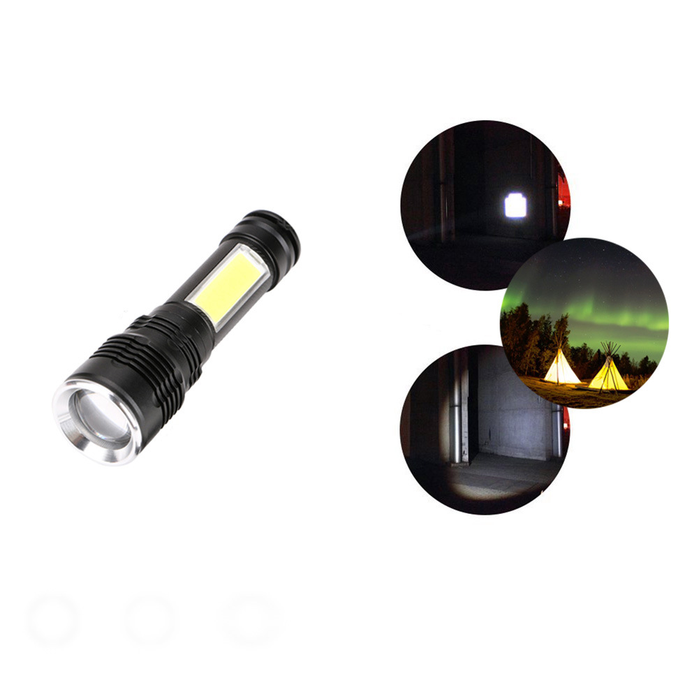 Product Description: Color: Black Material: Aluminum Alloy Lamp: 1*T6 LED + 1*COB LED 4 modes: High brightness T6, Low brightness T6, Flash brightness T6, High intensity COB Battery: 1*18650 (Not Included) Size: 13 * 3.6 cm Weight: 100 grams Dimming Type: Rotatable Focus Adjustment Including: 1 * LED Lighting |