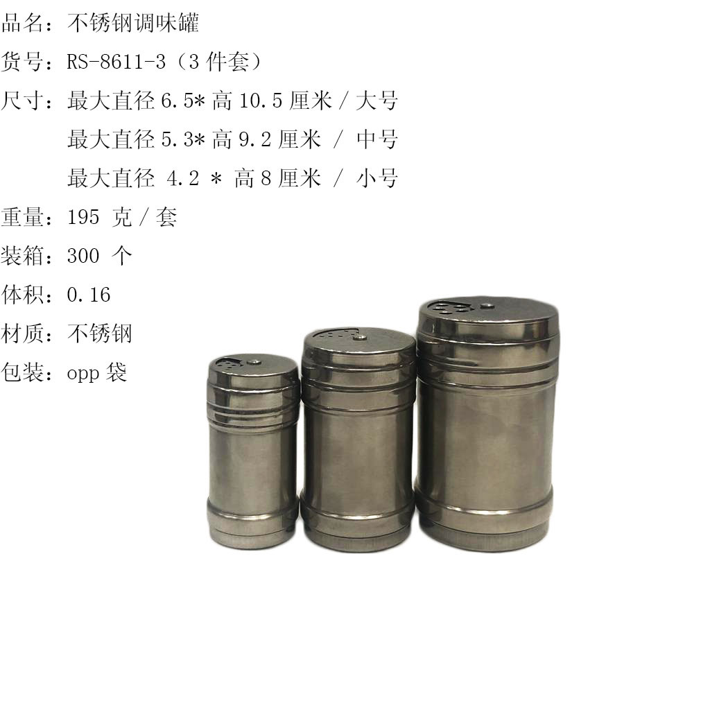ITEM NO.【Product Model Number】: RS-8609 (Small Size) NAME【Product Name】: Stainless Steel Seasoning Jar/Toothpick Container QTY【Quantity】: 600 pieces "CBM【纸箱体积】:0.13 Material【Product Material】: Stainless Steel Color【Product Color】:Qing dress Weight: 42 grams Packaging: Film Bag "W.G【Gross Weight of a Full Container】:26.5kilogram N.G【Gross Weight of the Full Container】: 25.2 kg"斤"在中文中通常指的是重量单位,1斤等于500克。如果您需要翻译其他与"斤"相关的文本,请提供具体内容。 SIZE【Product Size】: Maximum Diameter 4.2* High 8centimeter Warm Tip: The mouth of the seasoning jar has three different sized holes. Rotate the lid to choose the size of the seasoning inside. For coarse seasoning, choose the large hole, for small seasoning, choose the small hole, and there is a medium hole for your choice. When not in use, you can turn it to the hole-free position to prevent the seasoning from accidentally spilling out. The small seasoning jar can also be used as a toothpick container.