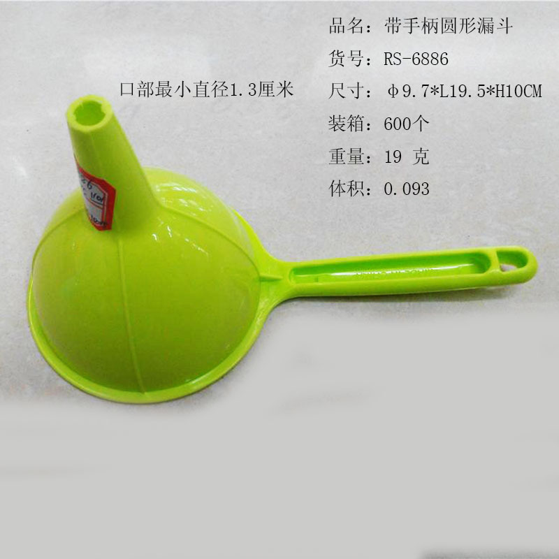 ITEM NO.【Product Model Number】: RS-6886 NAME【Product Name】: Long-Handle Funnel QTY【Quantity】: 600 pieces "CBM【纸箱体积】:0.093 Material【Product Material】:PP Color【Product Color】:mixed loading Weight: 19 grams Packaging【包装方式】:Bulk "W.G【Gross Weight of a Full Container】:12.5kilogram N.G【Gross Weight of the Full Container】: 11.5 kg"斤"在中文中通常指的是重量单位,1斤等于500克。如果您需要翻译其他与"斤"相关的文本,请提供具体内容。 SIZE【Product Size】: Maximum Diameter 9.7*Handle with 19.5* Height 10centimeter