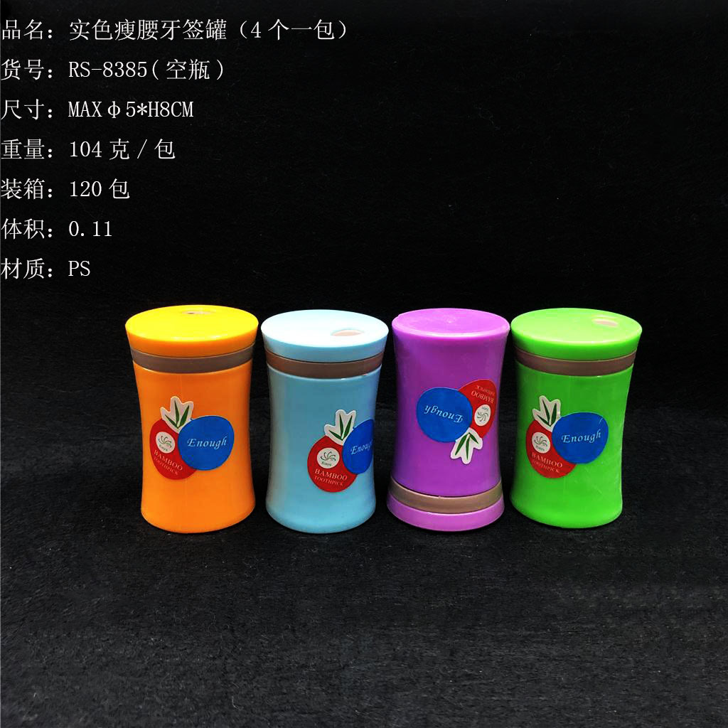 ITEM NO.【Product Model Number】: RS-8383 NAME【Product Name】: European-style Solid Color Toothpick Container (Empty Bottle) QTY【Quantity】: 240 Packs "CBM【纸箱体积】:0.11 Material【Product Material】:PS Color【Product Color】:mixed loading Weight: 52 gramspackage :"Packaging【Packaging Method】:2 pieces in an OPP bag "W.G【Gross Weight of a Full Container】:13.5kilogram N.G【Gross Weight of the Full Container】: 12.5 kg"斤"在中文中通常指的是重量单位,1斤等于500克。如果您需要翻译其他与"斤"相关的文本,请提供具体内容。 SIZE【Product Size】: Maximum Diameter5 * 8centimeter