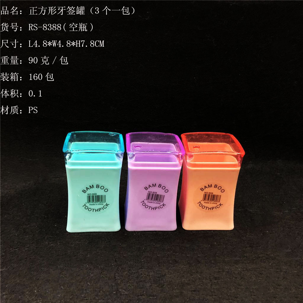 ITEM NO.【Product Model Number】: RS-8387 NAME【Product Name】: High-end Square Toothpick Container (Empty Bottle) QTY【Quantity】: 240 Packs "CBM【Carton Volume】:0.1 Material【Product Material】:PS Color【Product Color】:mixed loading Weight: 60 gramspackage :"Packaging【Packaging Method】:2 pieces in an OPP bag "W.G【Gross Weight of a Full Container】:15.5kilogram N.G【Gross Weight of the Full Container】: 14.5 kg"斤"在中文中通常指的是重量单位,1斤等于500克。如果您需要翻译其他与"斤"相关的文本,请提供具体内容。 SIZE【Product Size】: Length 4.8* Width 4.8* Height: 7.8 meterscentimeter
