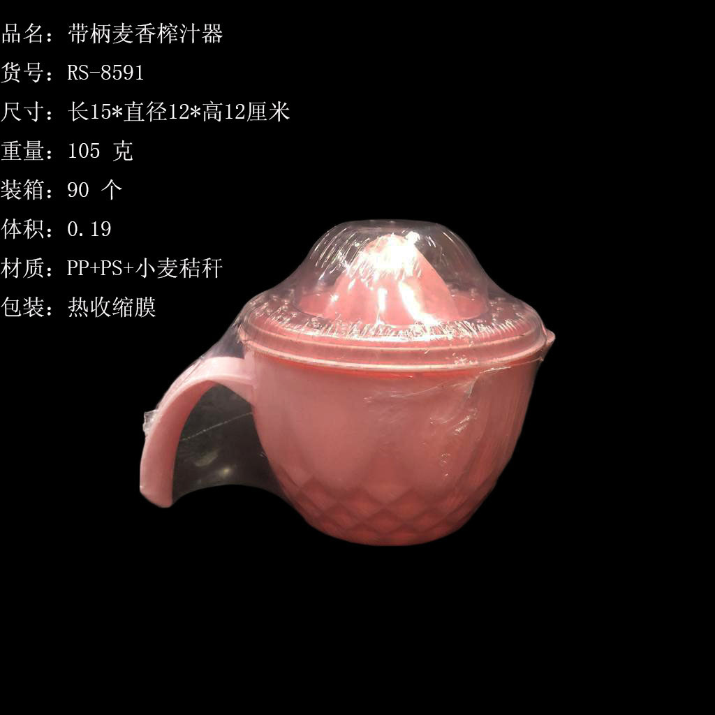ITEM NO.【Product Model Number】: RS-8588 NAME【Product Name】: Cover-mounted Wheat-flavor Juicer QTY【Quantity】: 144 pieces "CBM【纸箱体积】:0.145 Material【Product Material】: PP+Wheat Straw+PS Color【Product Color】:mixed loading Weight: 92 grams Packaging: Heat Shrink Film "W.G【Gross Weight of a Full Container】:14.5kilogram N.G【Gross Weight of the Full Container】: 13.2 kg"斤"在中文中通常指的是重量单位,1斤等于500克。如果您需要翻译其他与"斤"相关的文本,请提供具体内容。 SIZE【Product Size】: Length 15 (Diameter 11.5)*Height: 10.5 meterscentimeter
