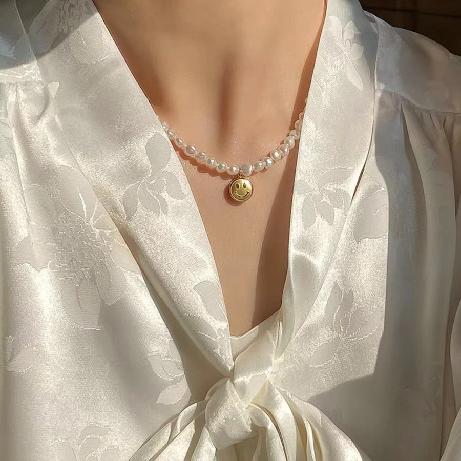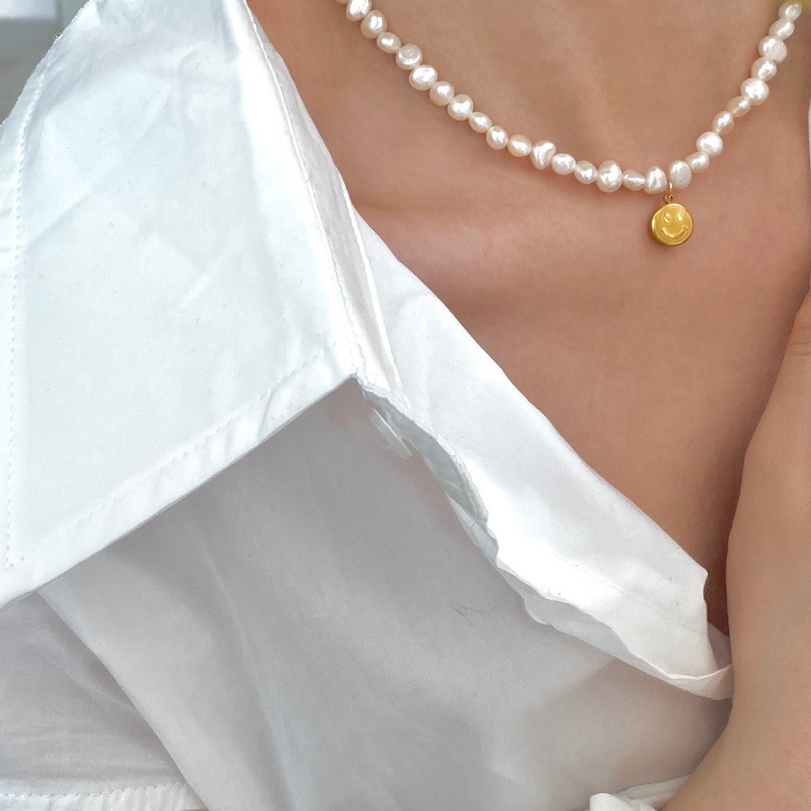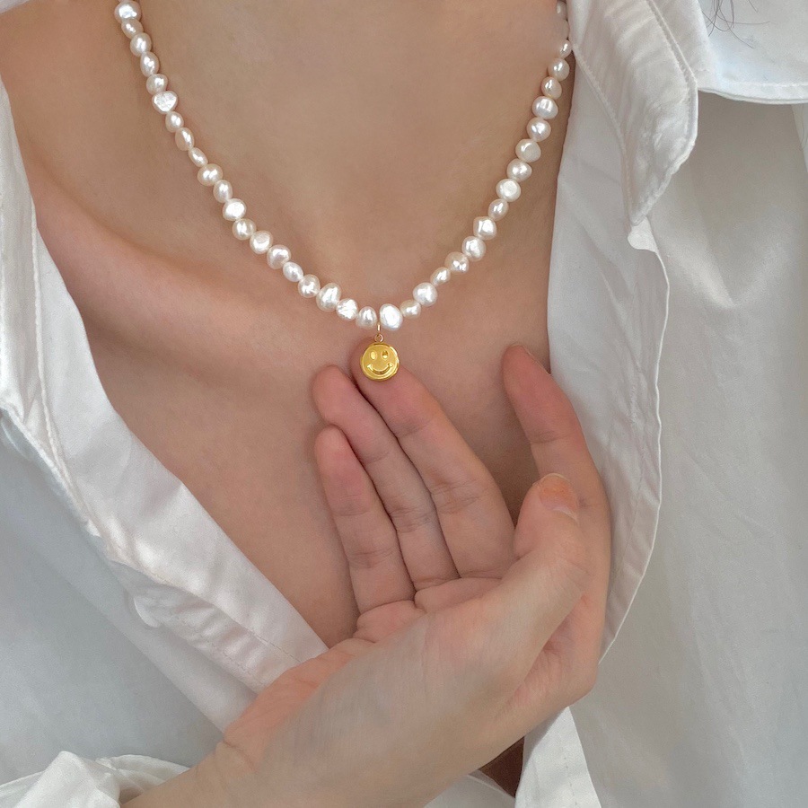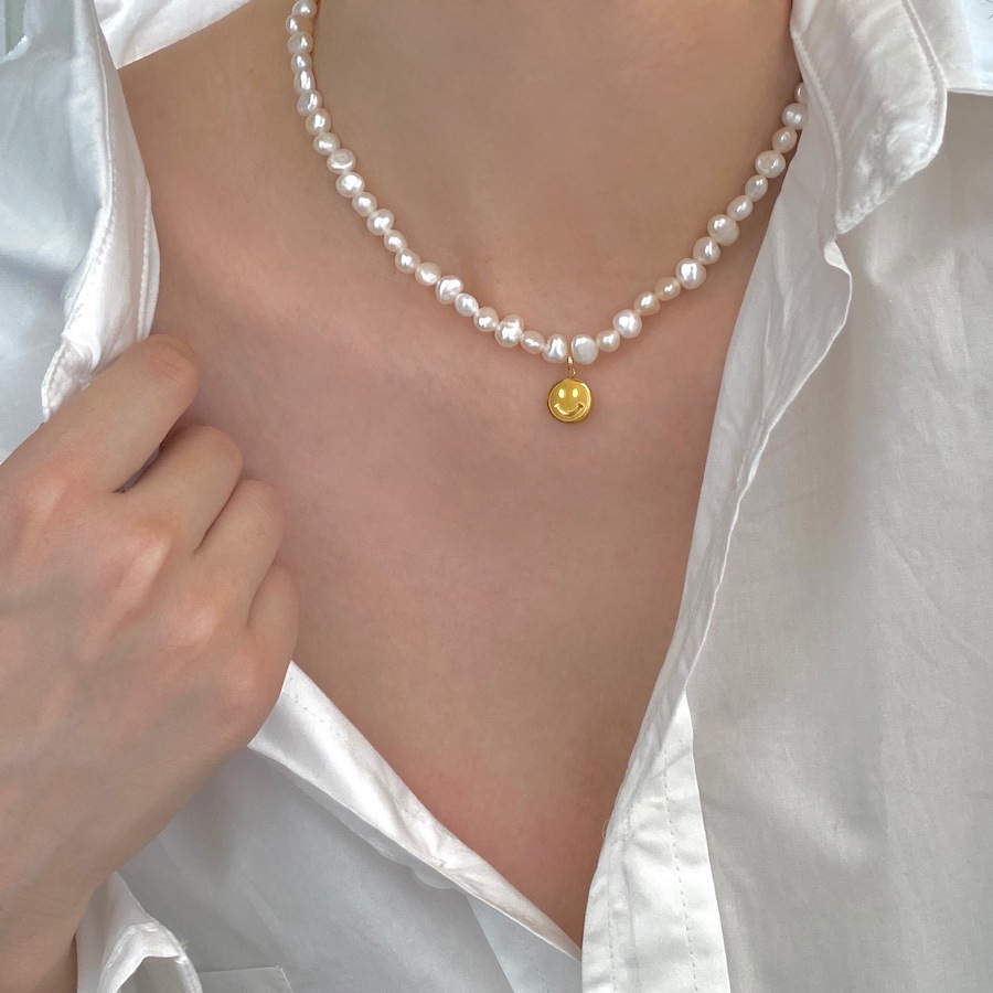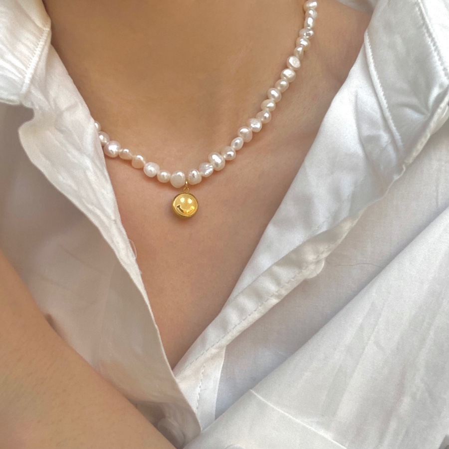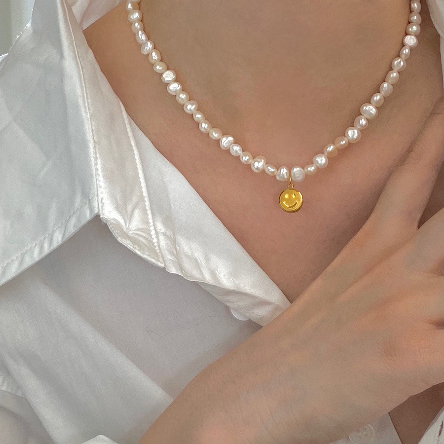 baroque freshwater pearl titanium steel smiley necklace