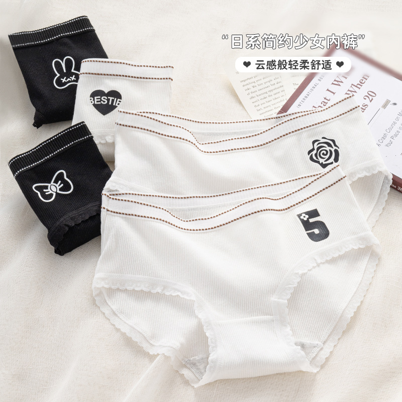 Japanese Style Simple Black and White Girl Underwear Pure Cotton Breathable Skin-Friendly Comfortable Elastic Mid-Waist Student Printed Briefs