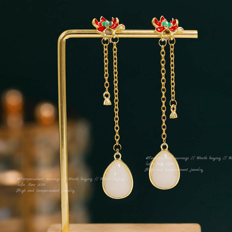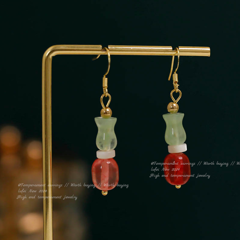16# red little flower white jade water drop double tassel ear hook