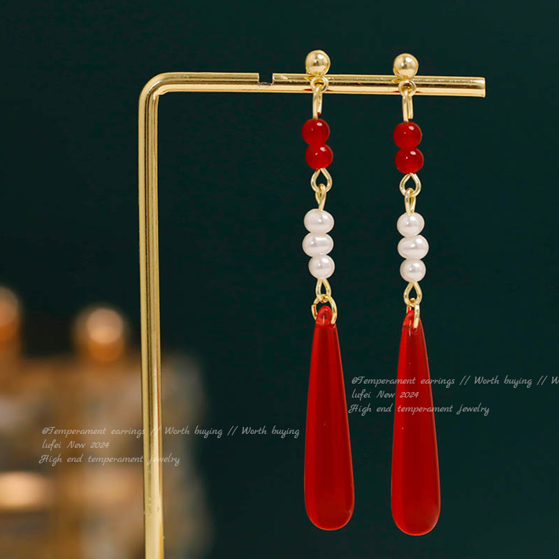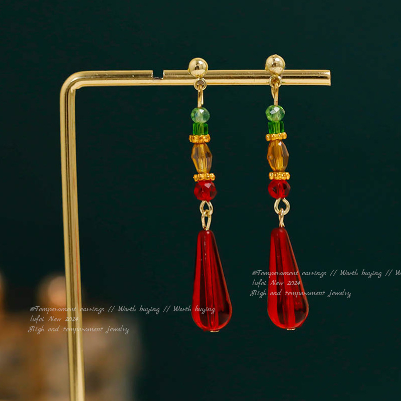 12# long water drops red eardrops stud earrings