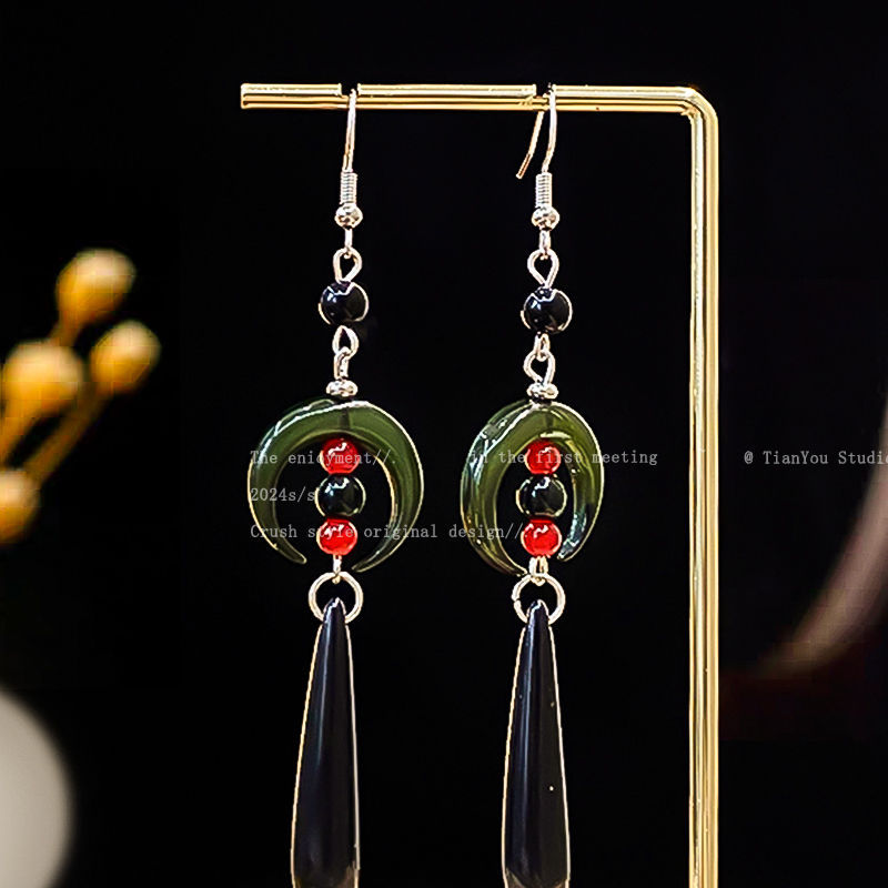25# new chinese style round beads dark green moon ear hook