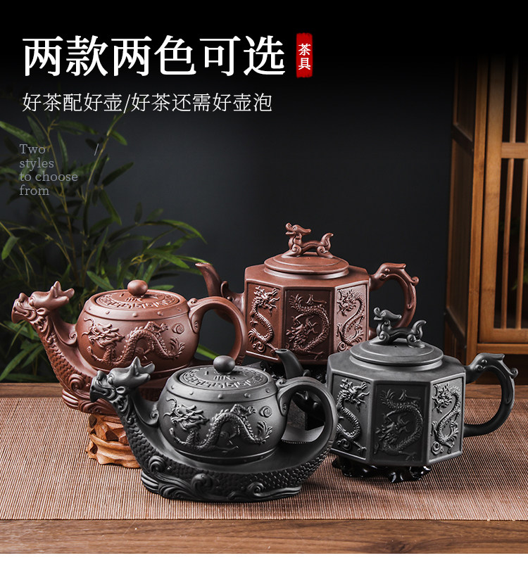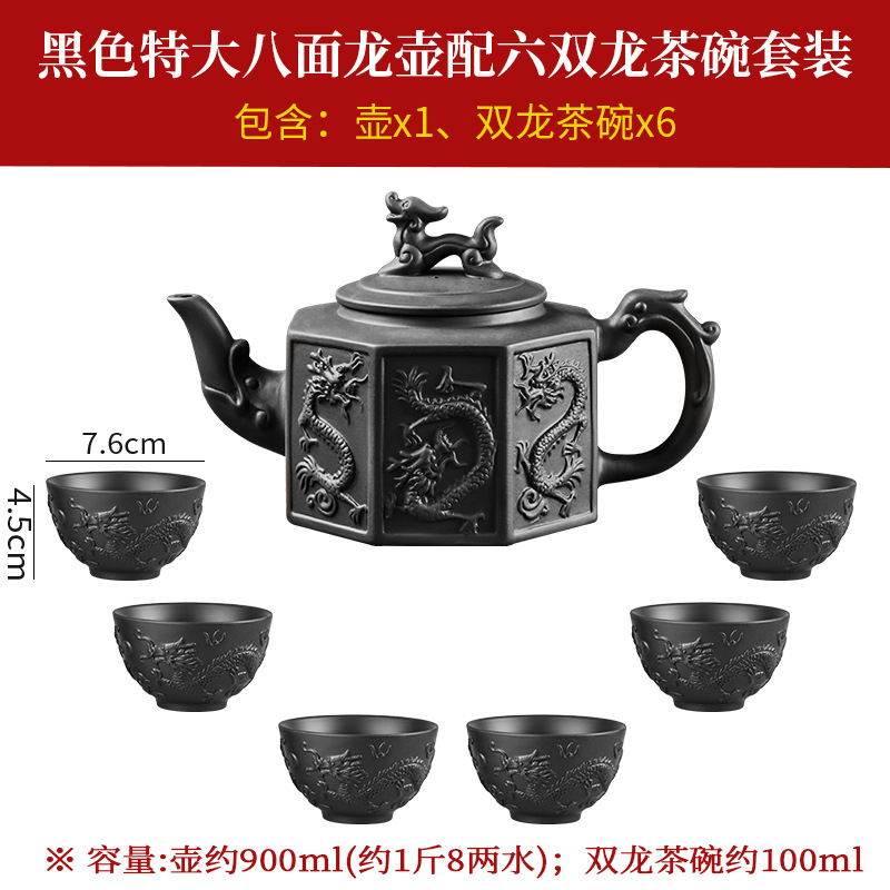black extra large eight-sided dragon pot +6 double dragon tea bowls
