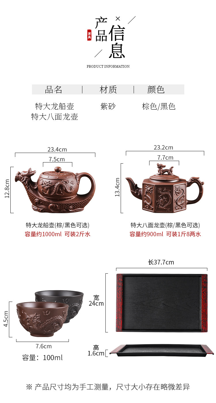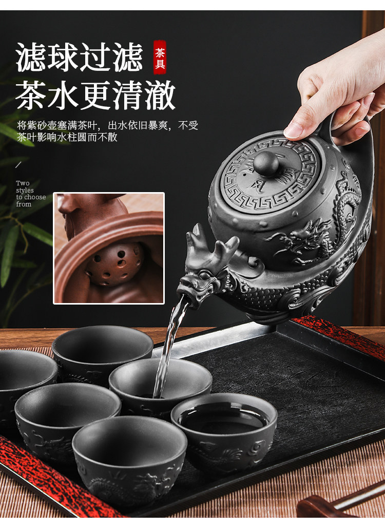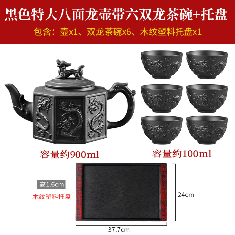 black extra large eight-sided dragon pot +6 double dragon tea bowls + wood grain tray