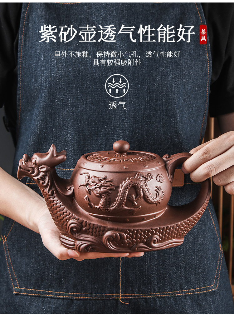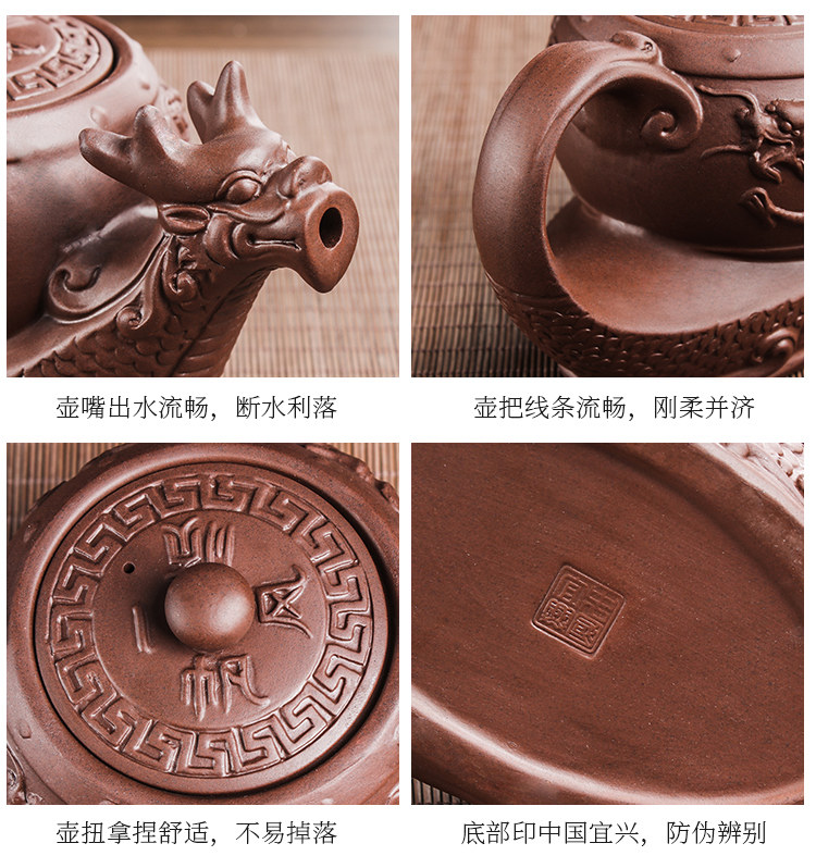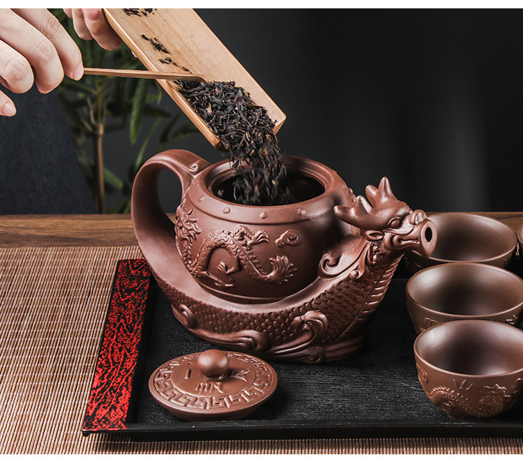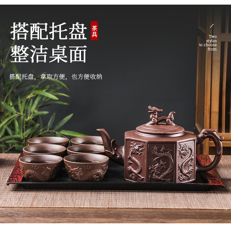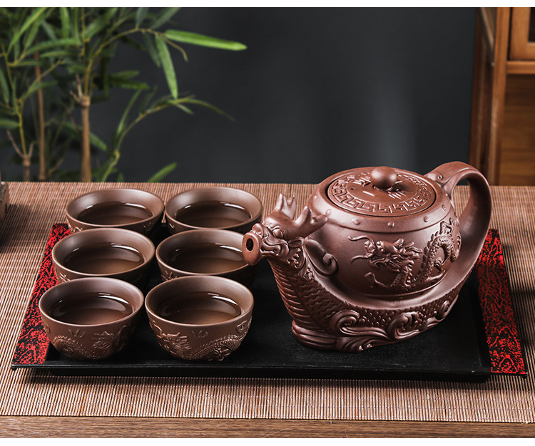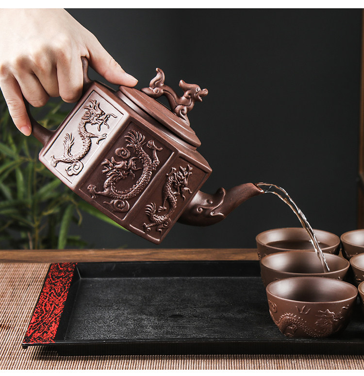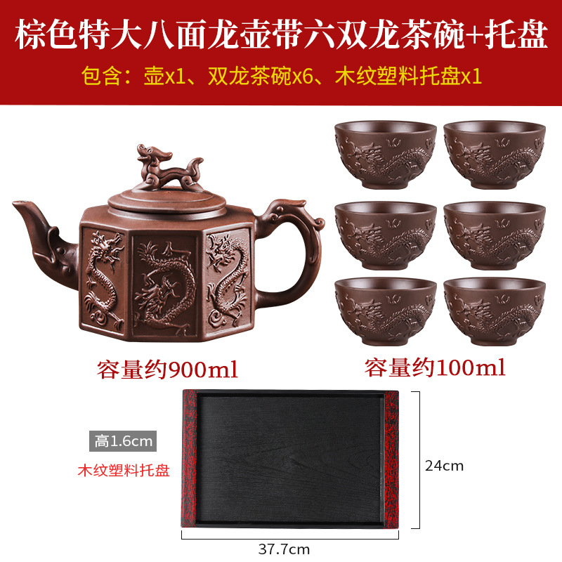 brown extra large eight-sided dragon pot +6 double dragon tea bowls + wood grain tray
