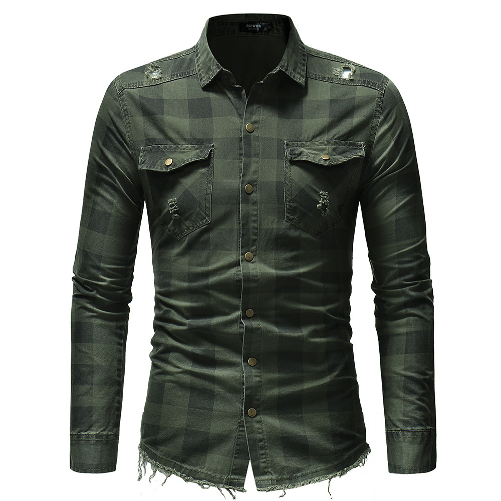 winter plaid long sleeve casual youth shirt slim lapel flannel shirt with logo embroidery