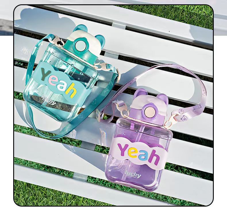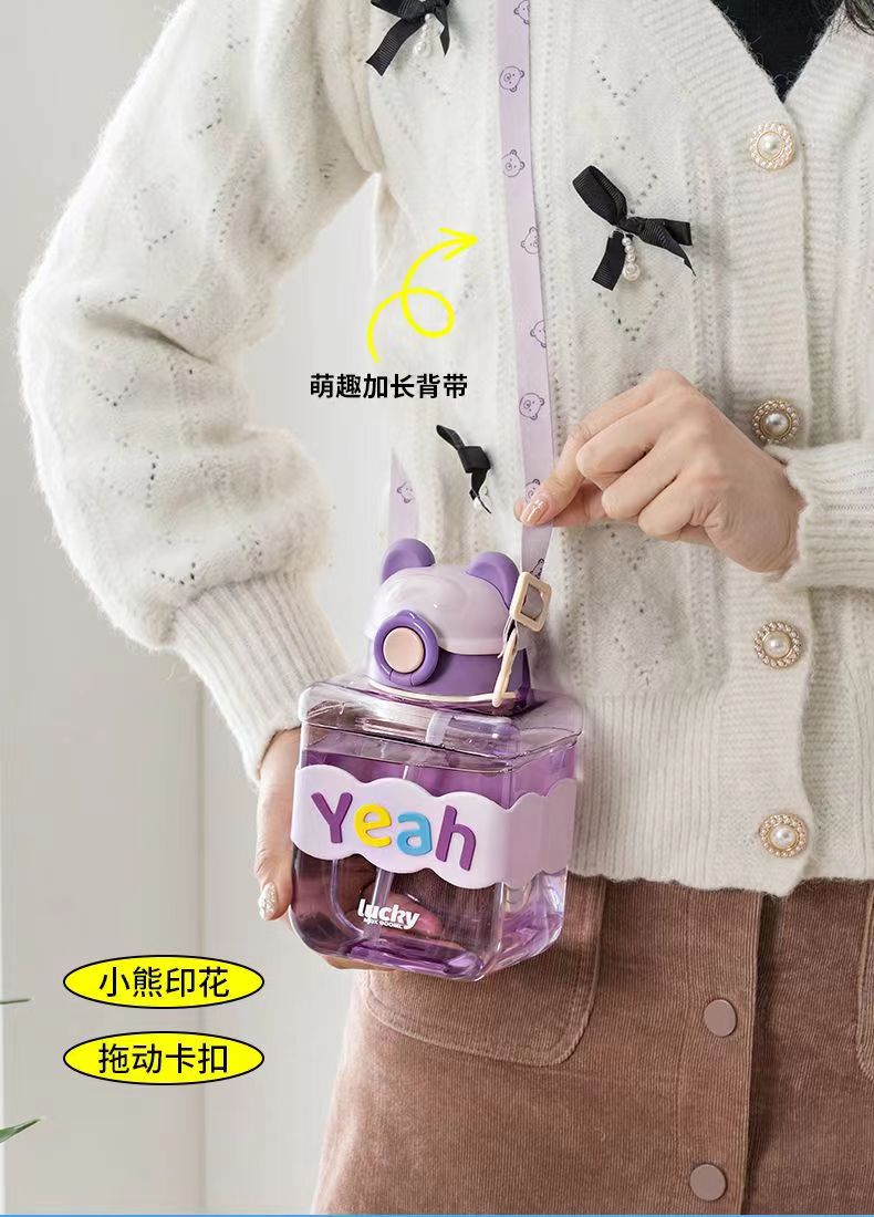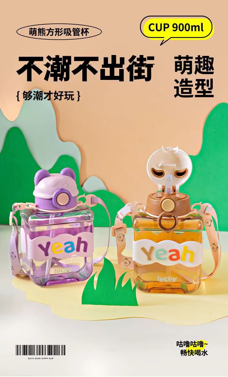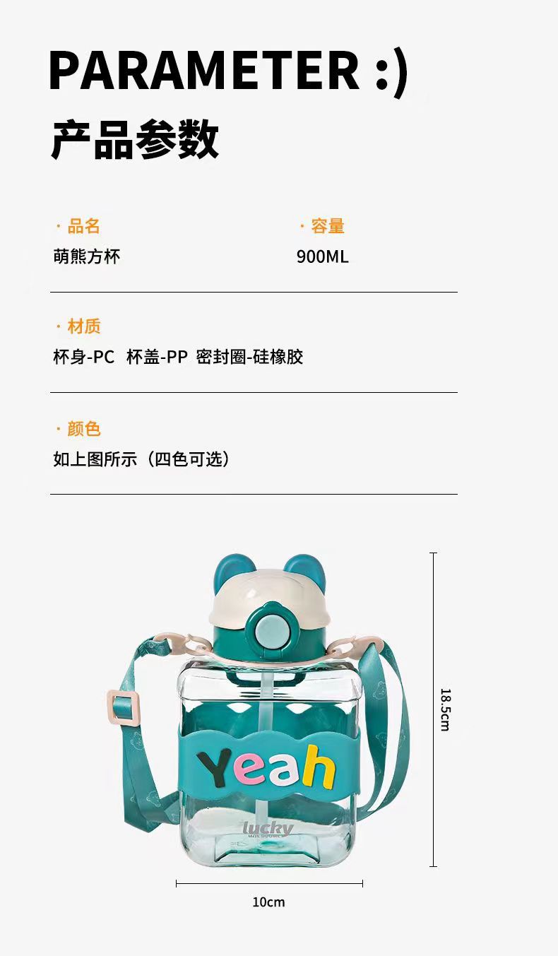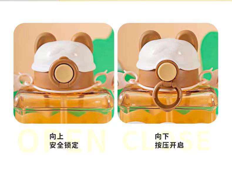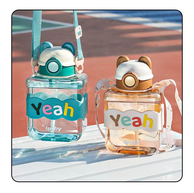 Bear Square Water Cup Cartoon Children's Pstic Cup Kindergarten Baby Straw Cup Student Portable Cute Water Bottle