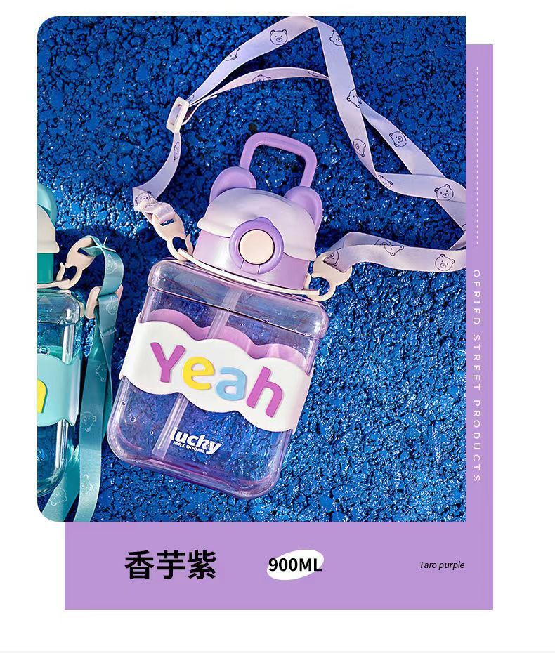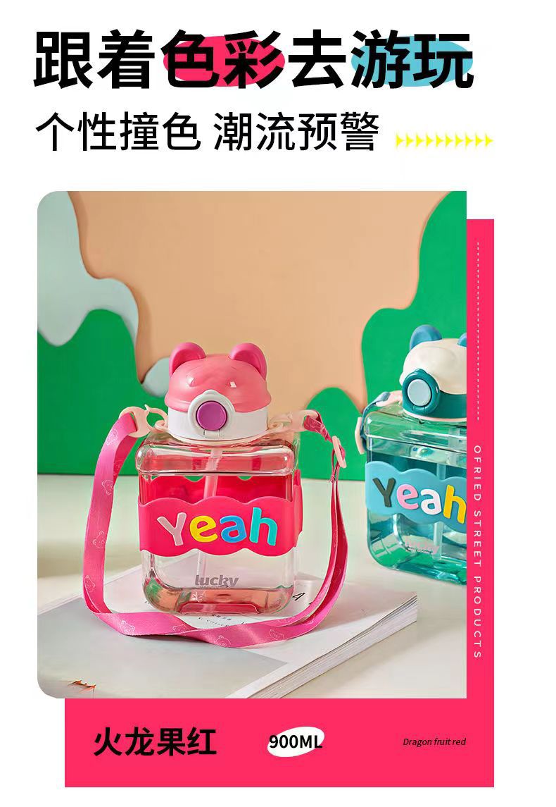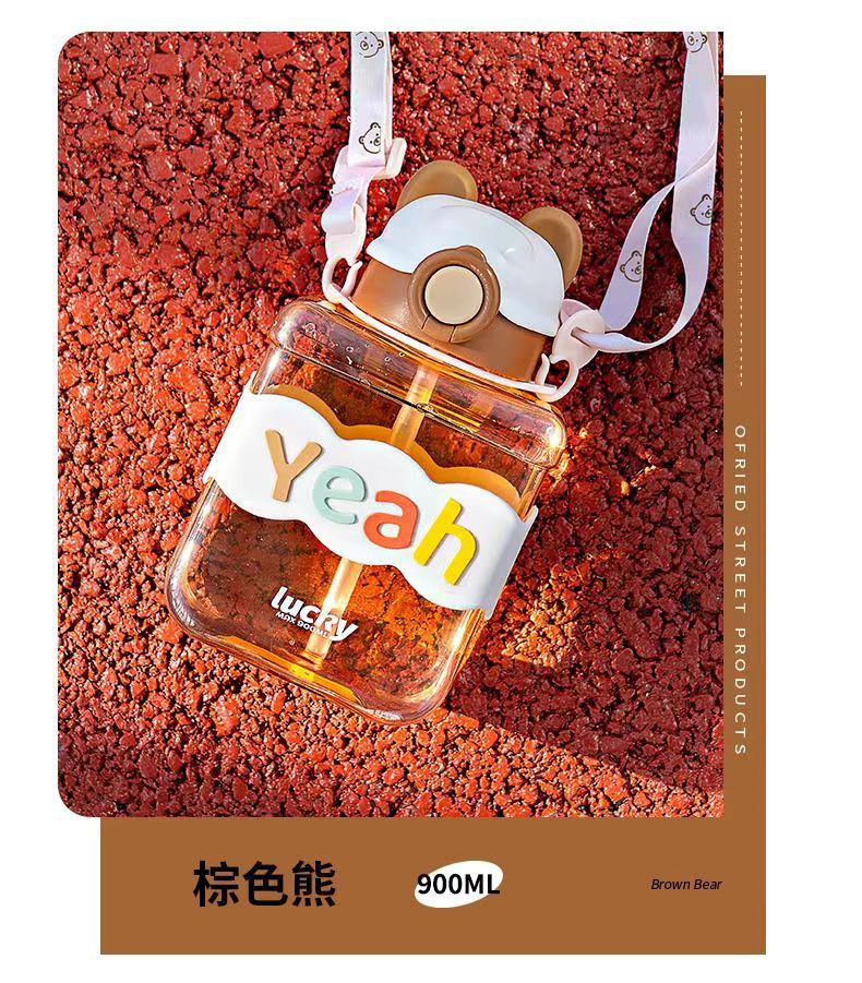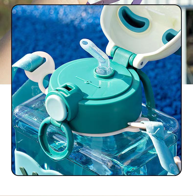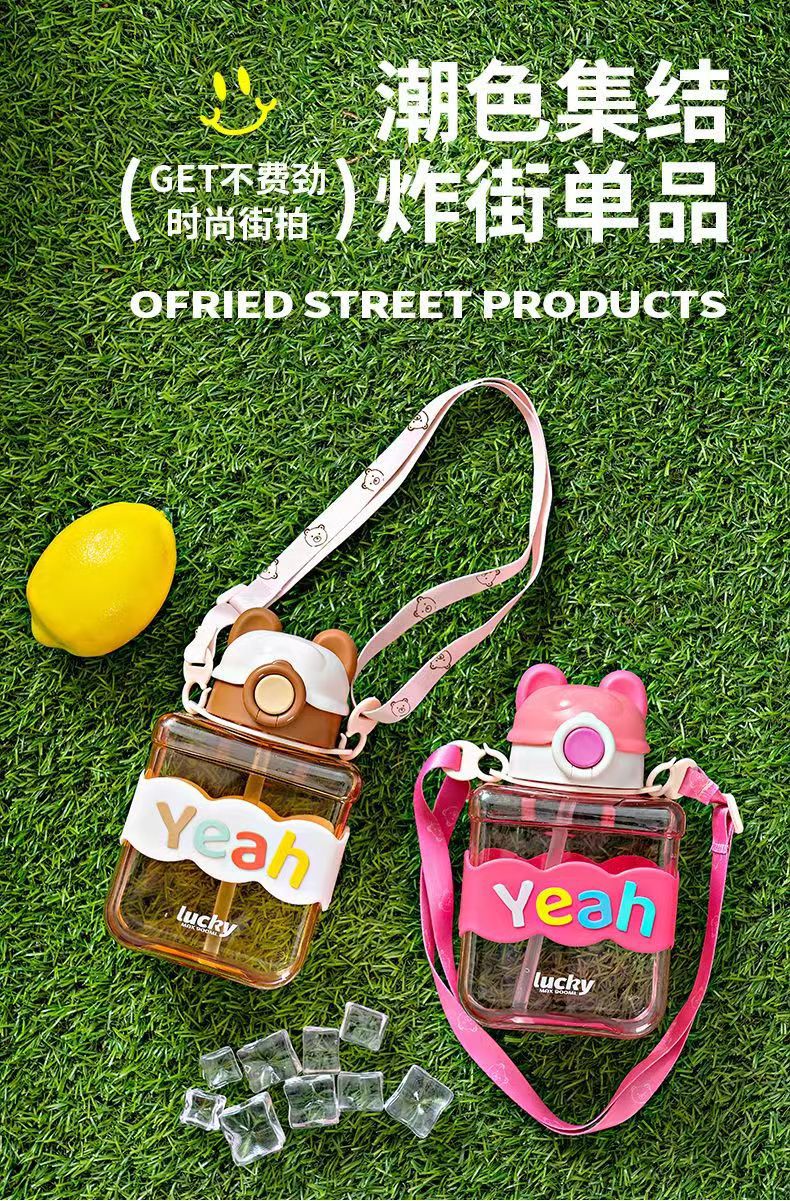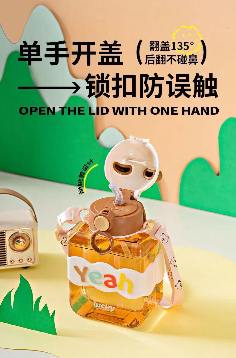 Bear Square Water Cup Cartoon Children's Pstic Cup Kindergarten Baby Straw Cup Student Portable Cute Water Bottle