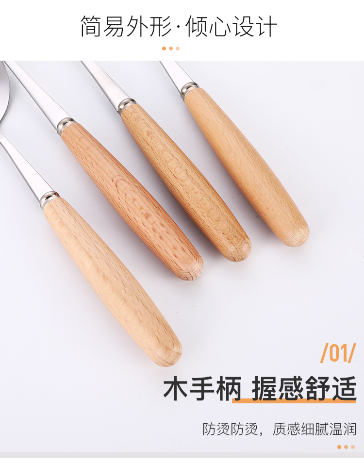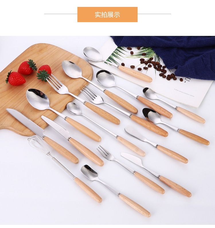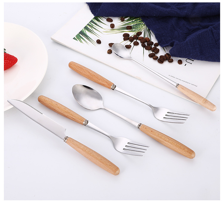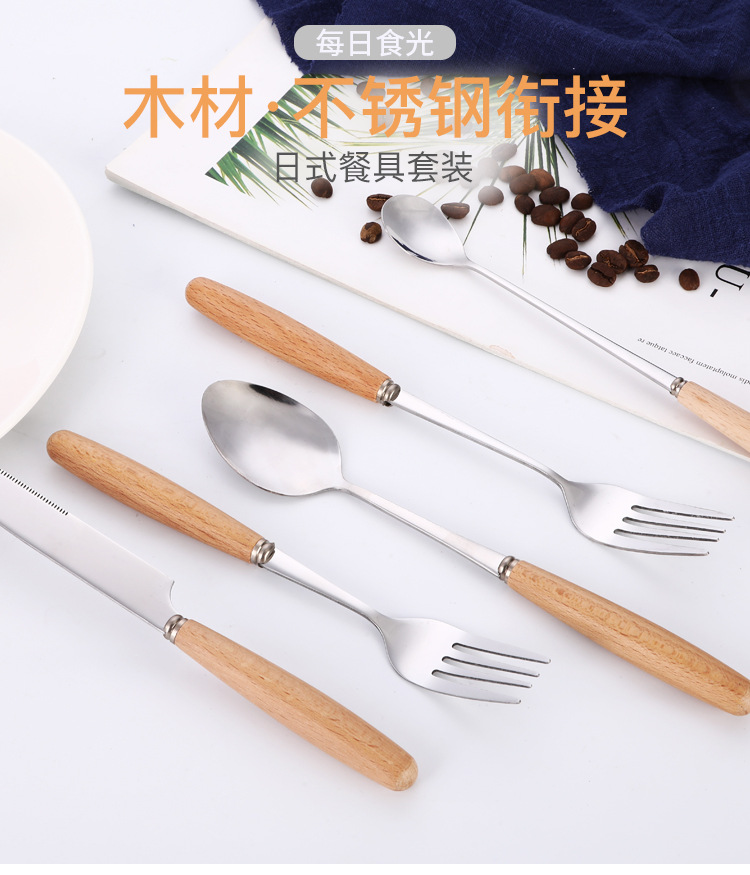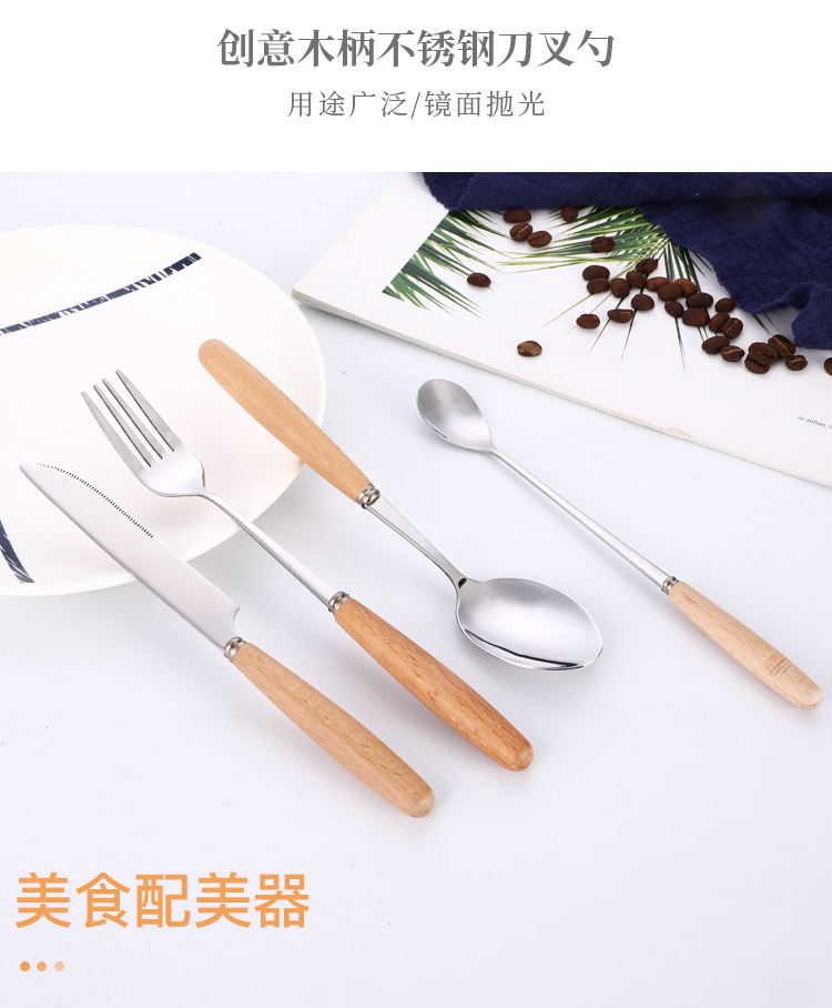 creative japanese style western tableware wooden handle stainless steel knife, fork and spoon hotel gift set coffee spoon long handle spoon wholesale