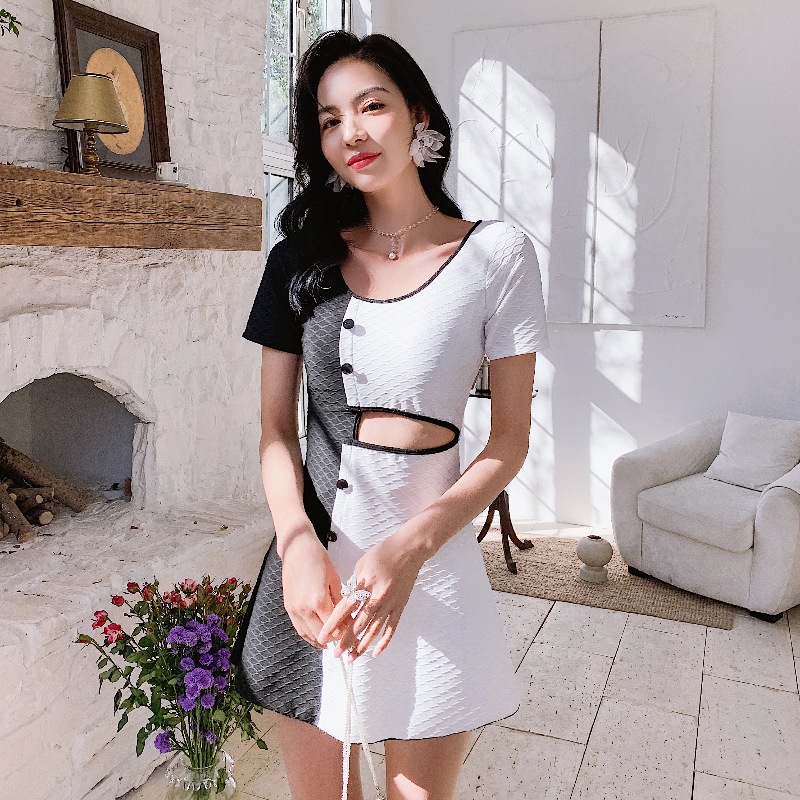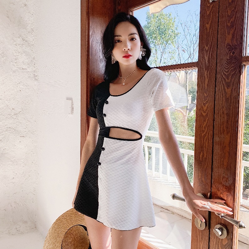 japanese and korean fashion one-piece skirt swimsuit hot spring slim cover belly conservative ins style contrast color fashion women's swimsuit