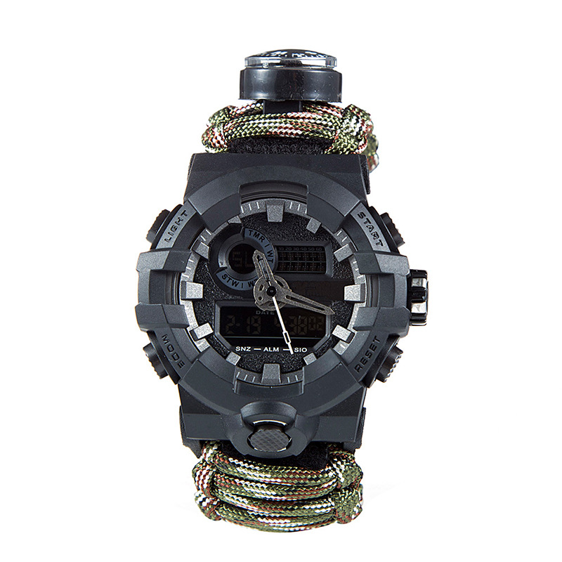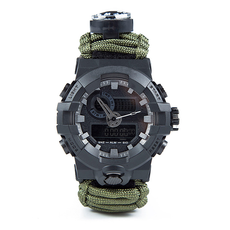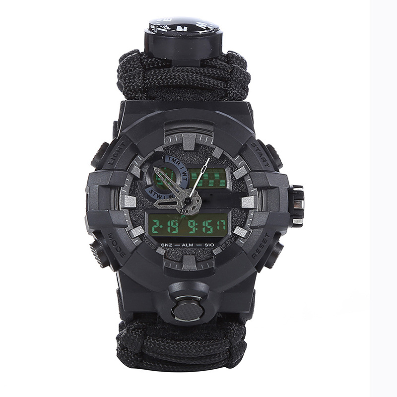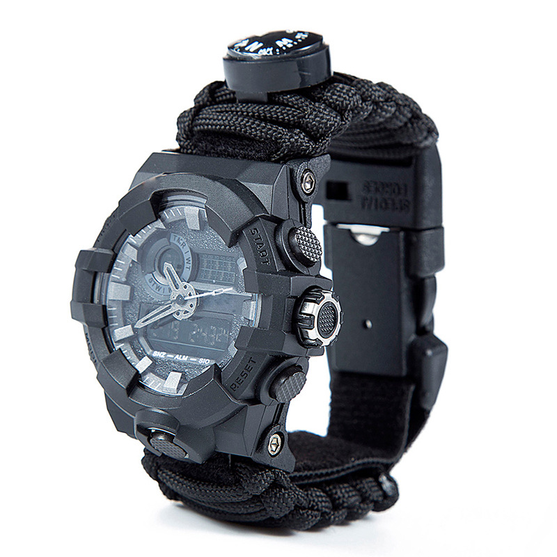 A seven-core parachute rope braided hot-selling night-light waterproof outdoor watch with more outdoor survival features. Equipped with outdoor life-saving fire-starting stone, cutting rope knife, survival whistle, high-precision compass, thermometer, and a approximately 3-meter long seven-core parachute rope, providing security for your outdoor exploration. Suitable for daily wear bracelet jewelry, in an emergency, it can be opened for hemostasis, making traps, tying temporary tents, and preventing equipment from being lost, etc., can be used for emergency rescue! The materials used are all parachute rope materials, the same as the ropes used on ships, with advantages such as corrosion resistance and anti-aging, and the single rope tension is about 400 jin. Each rope weighs 230 grams to 240 grams.
