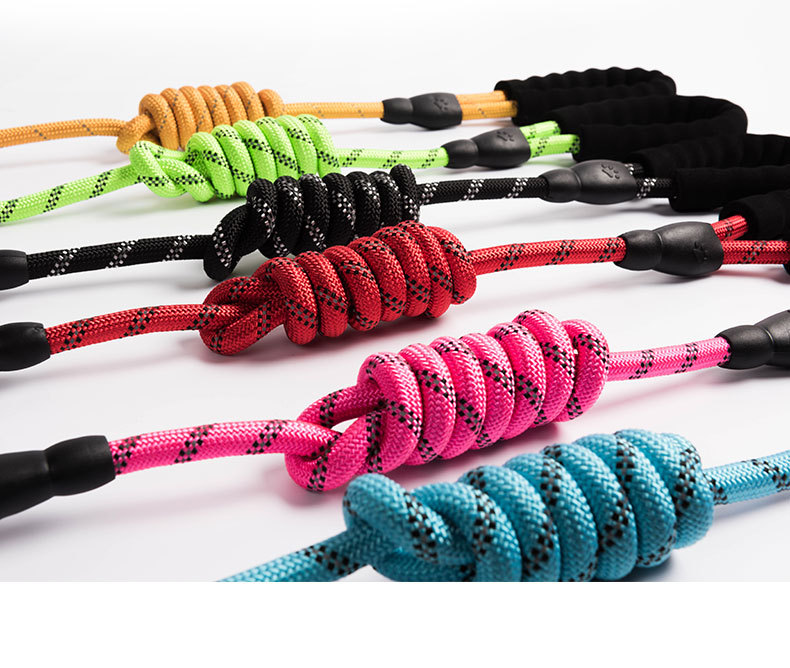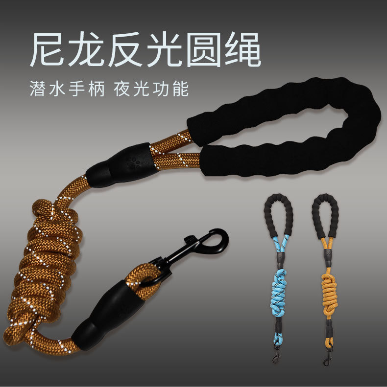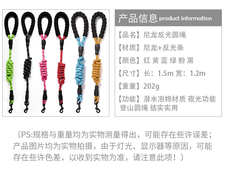 product features: comfortable foam handle, nylon reflective round rope material, multi-color optional, width 1.2cm, length 1.5 m, very suitable for walking dogs,