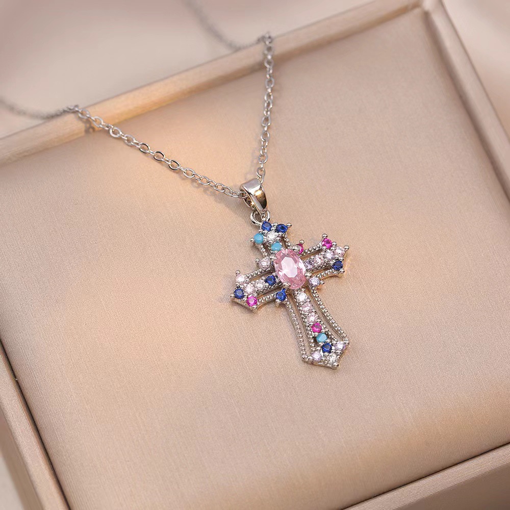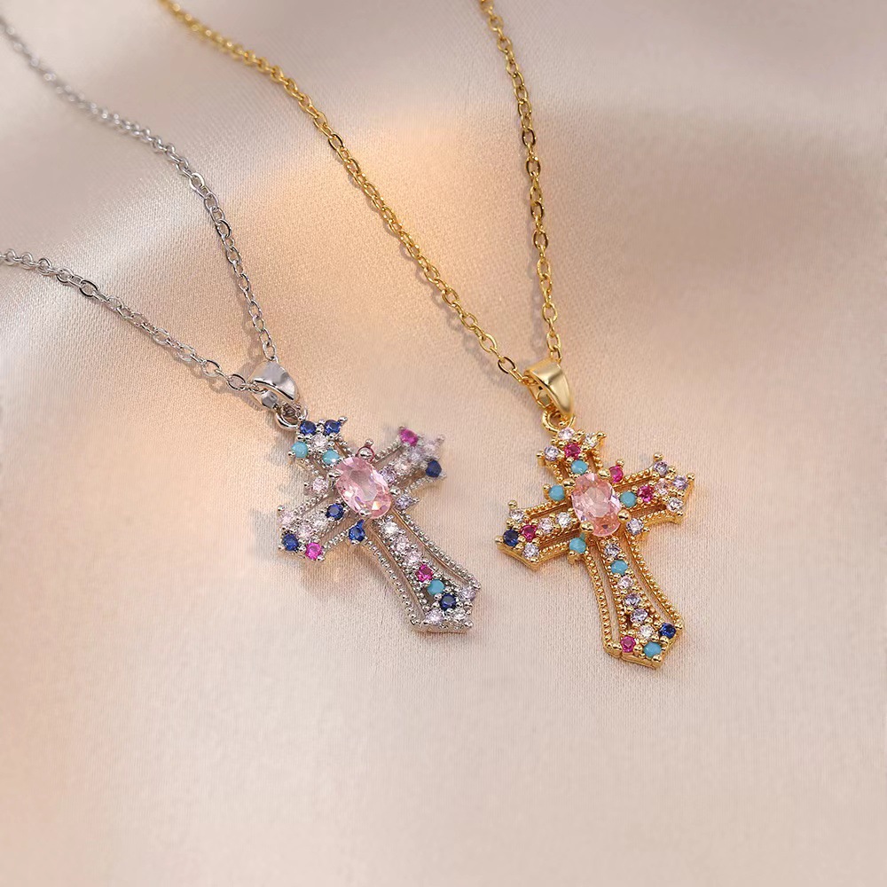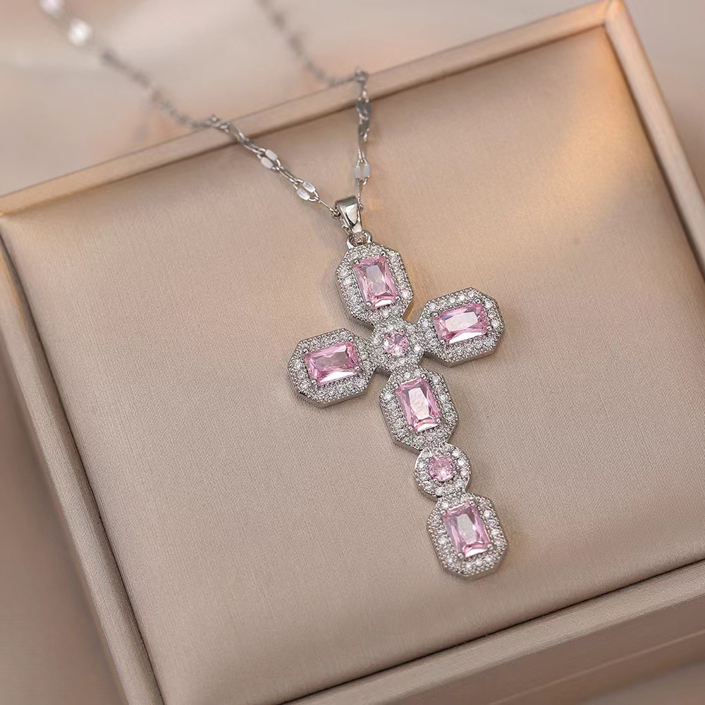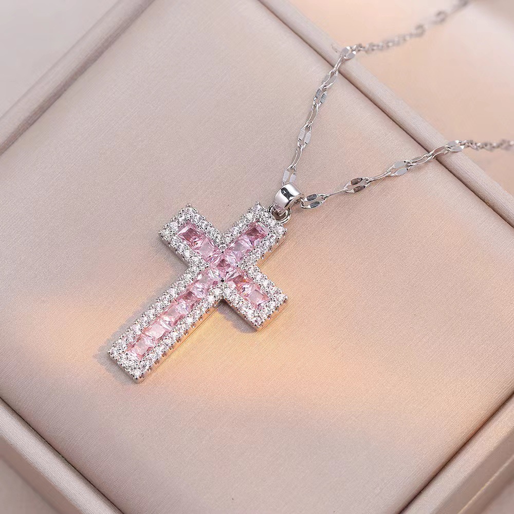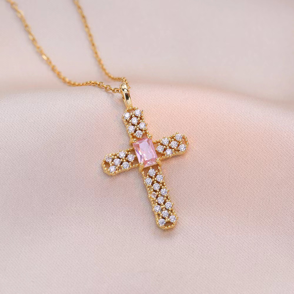 x2563 pink cross zircon necklace