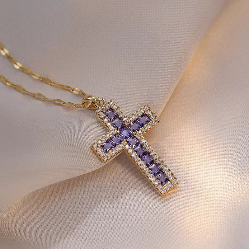 x1574 steel purple diamond cross necklace