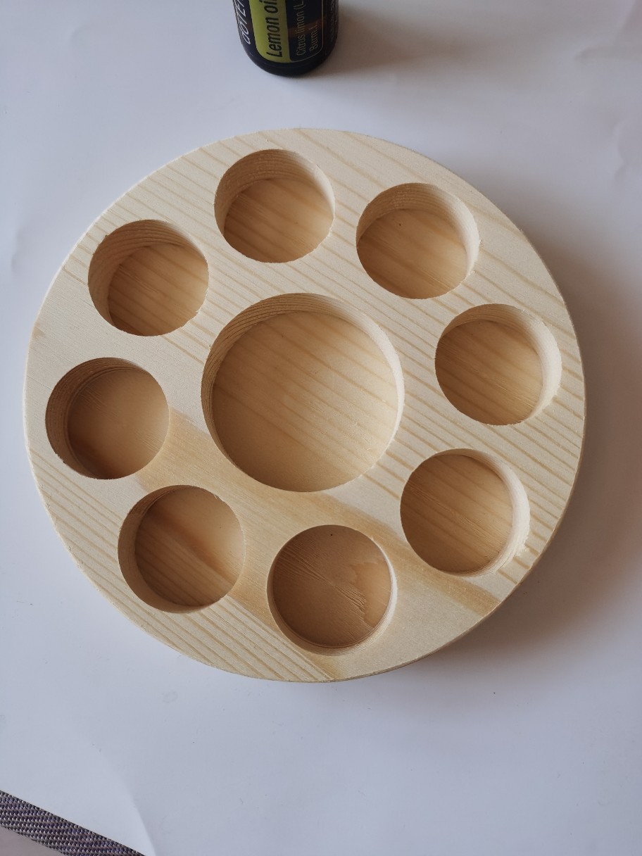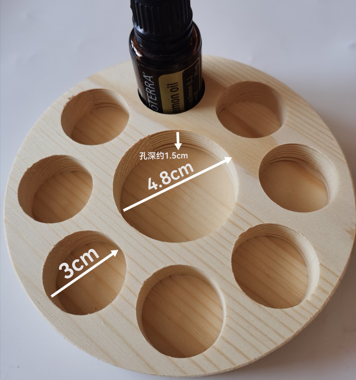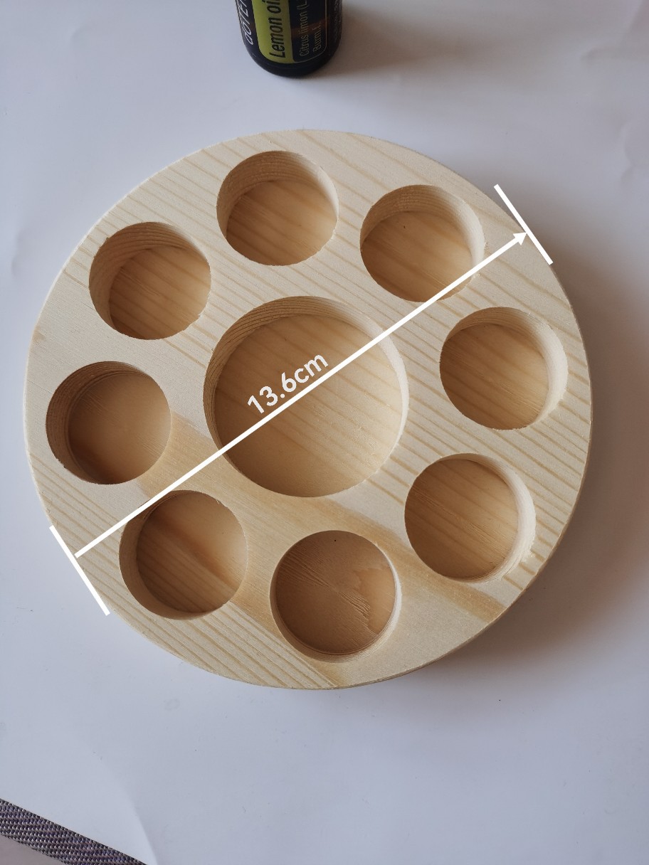 Product dimensions: Outer diameter 13.6cm, thickness about 2cm, hole depth about 1.5cm, large hole diameter about 4.8cm, can hold a bottle of coconut oil or 100ml base oil, small hole diameter about 3cm, can hold 8 15ml essential oil bottles.