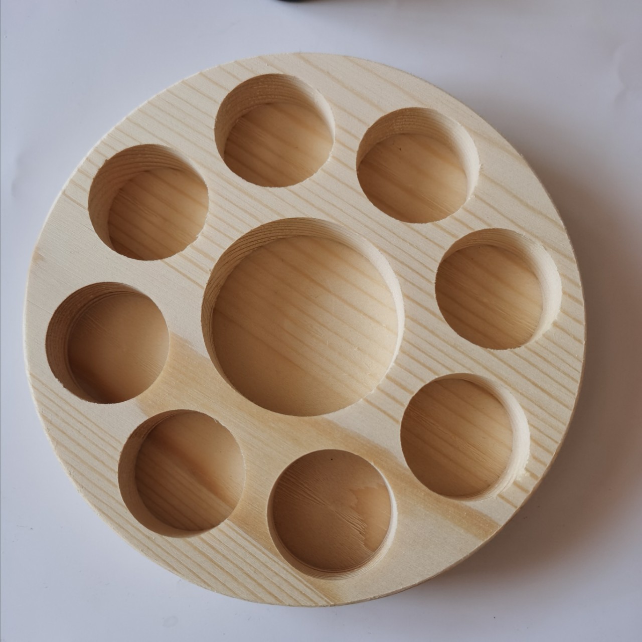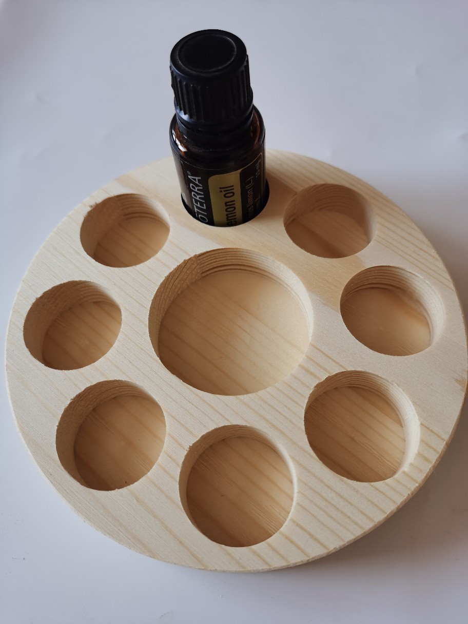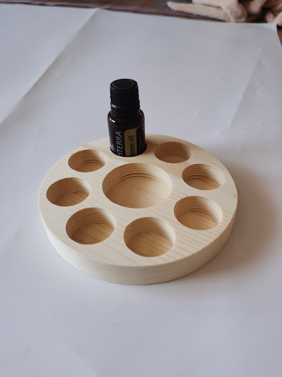 Product dimensions: Outer diameter 13.6cm, thickness about 2cm, hole depth about 1.5cm, large hole diameter about 4.8cm, can hold a bottle of coconut oil or 100ml base oil, small hole diameter about 3cm, can hold 8 15ml essential oil bottles.