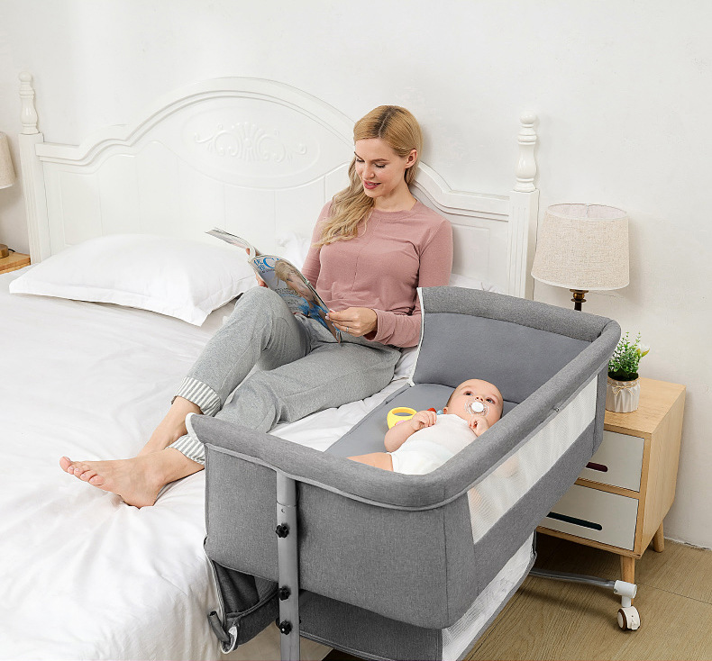 This baby cot is foldable, with casters and a mosquito net storage basket. The fabric is removable and machine washable (not suitable for machine washing).